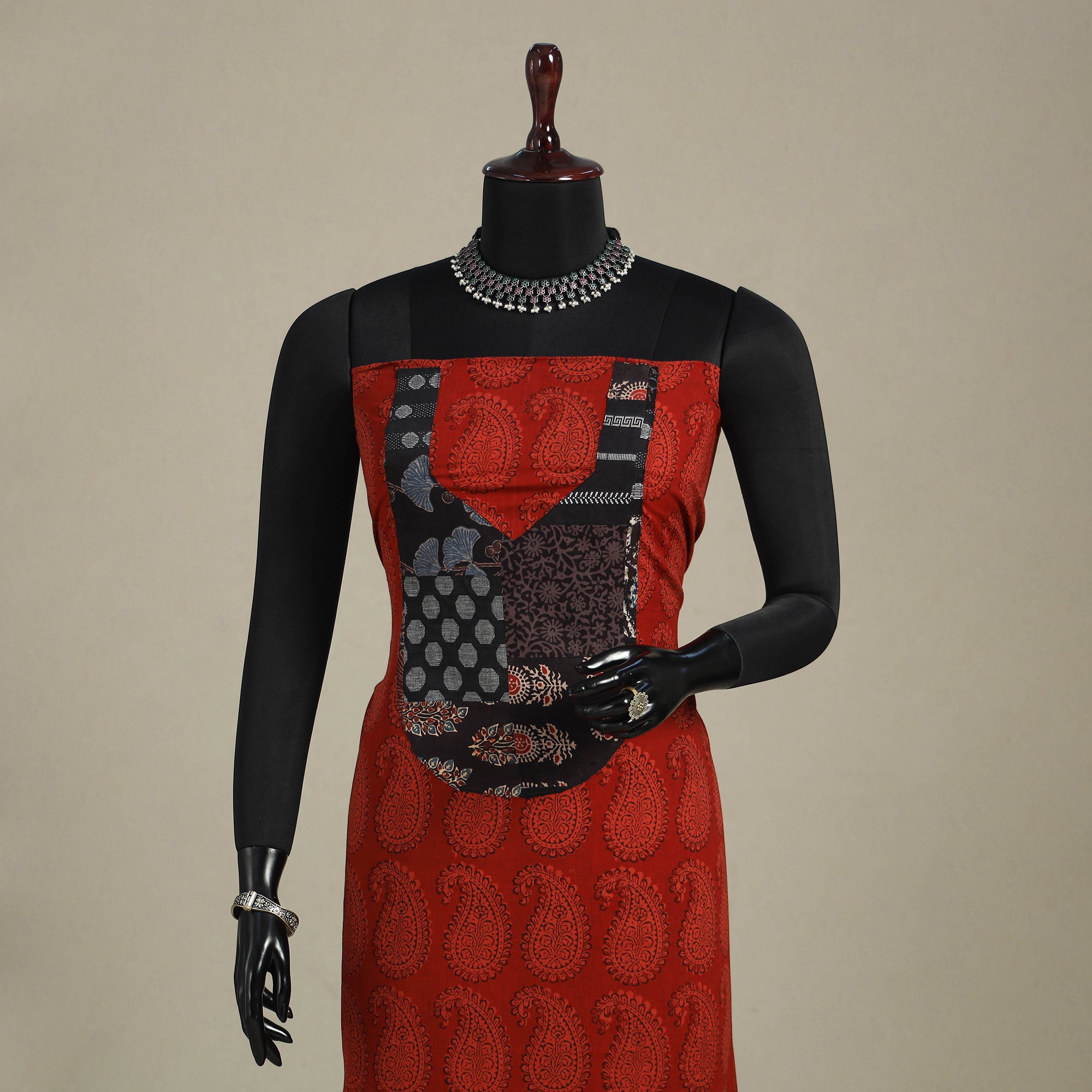 This red bagh print patchwork cotton kurta material features vibrant designs created using the traditional block printing technique from Bagh, Madhya Pradesh. Soft and breathable, it’s perfect for custom kurtas, offering both comfort and cultural style.