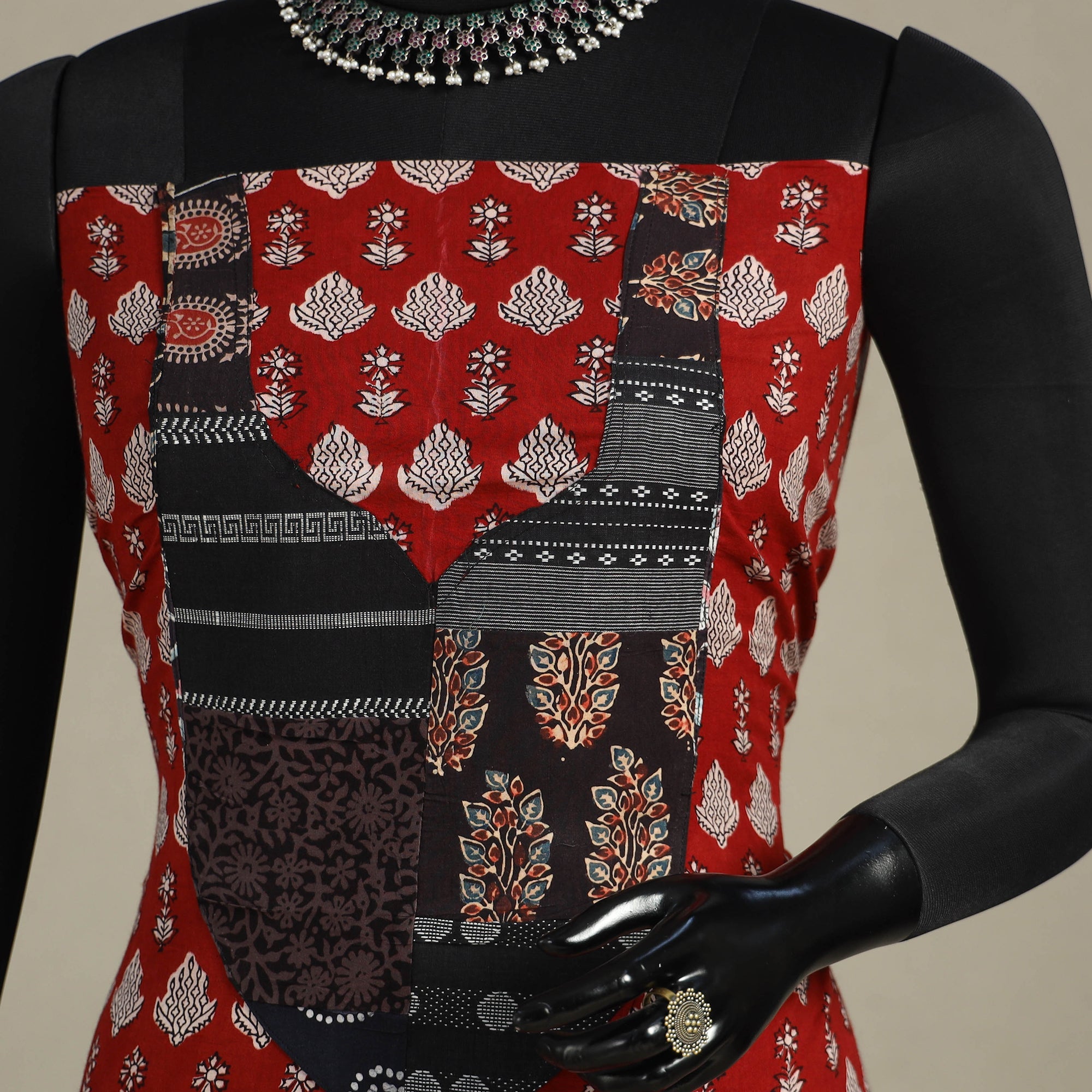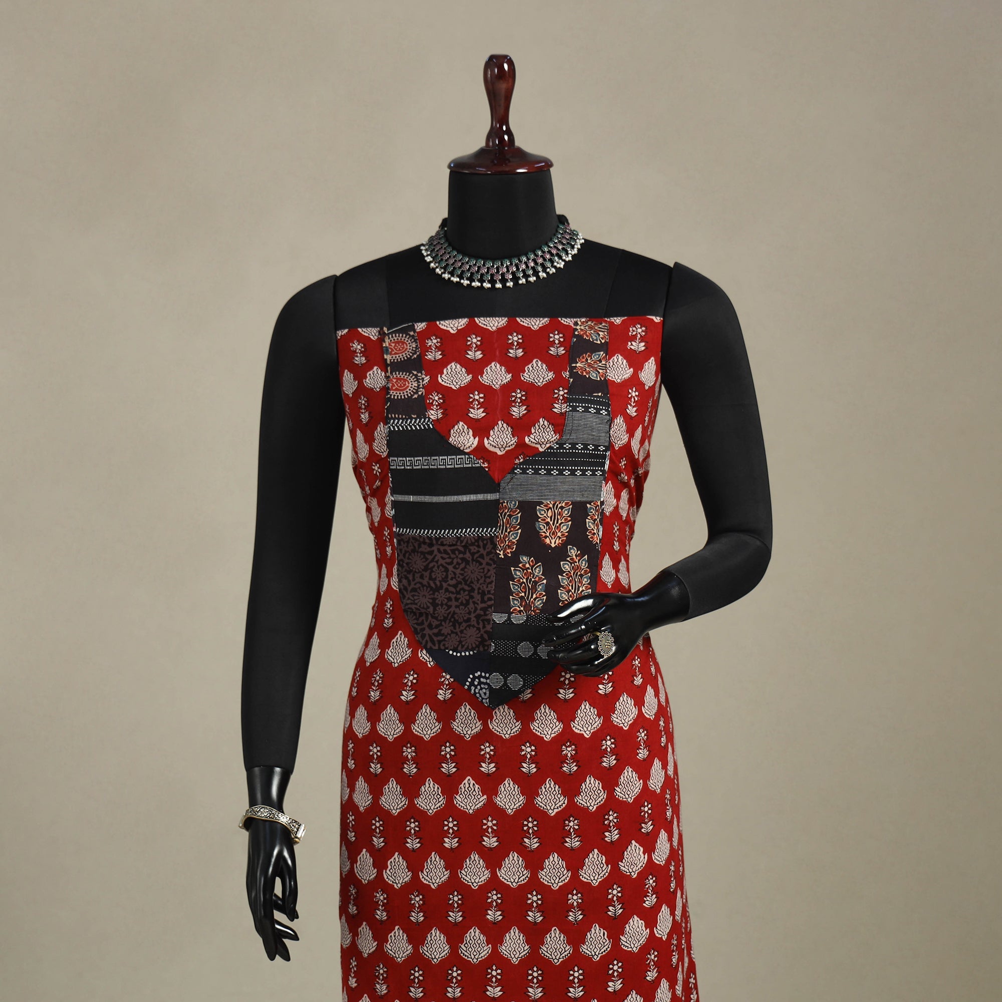 This red bagh print patchwork cotton kurta material features vibrant designs created using the traditional block printing technique from Bagh, Madhya Pradesh. Soft and breathable, it’s perfect for custom kurtas, offering both comfort and cultural style.