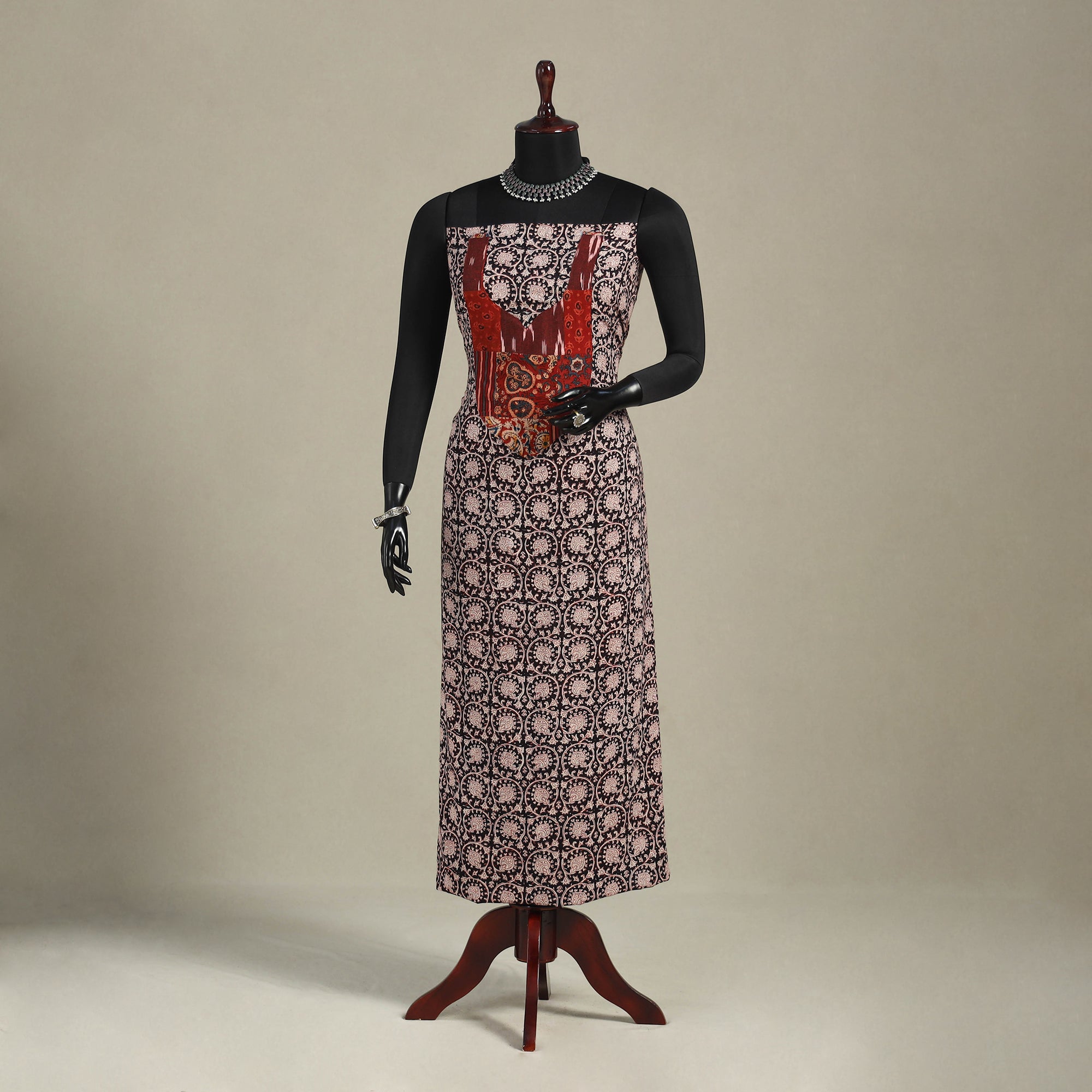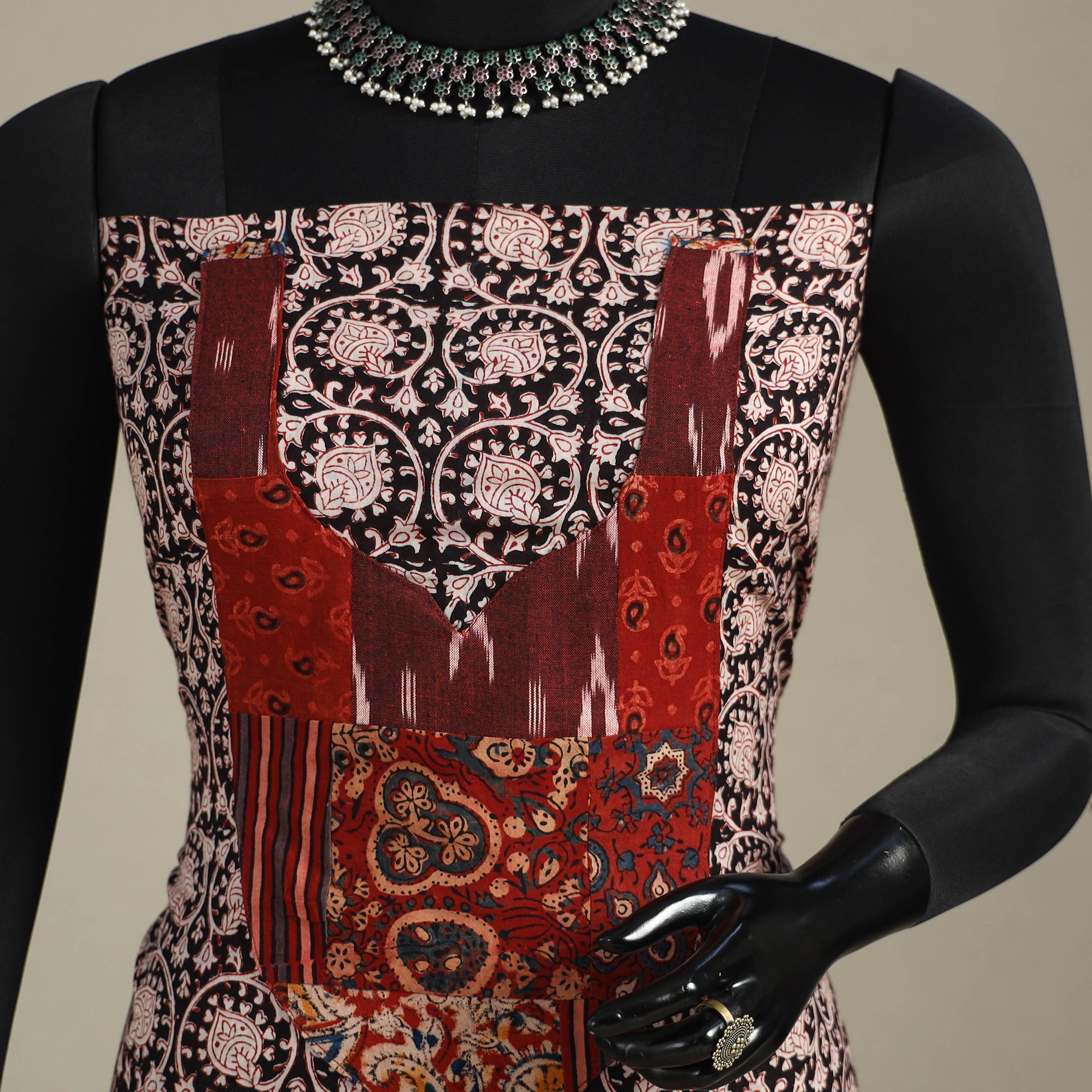 This black bagh print patchwork cotton kurta material features vibrant designs created using the traditional block printing technique from Bagh, Madhya Pradesh. Soft and breathable, it’s perfect for custom kurtas, offering both comfort and cultural style.