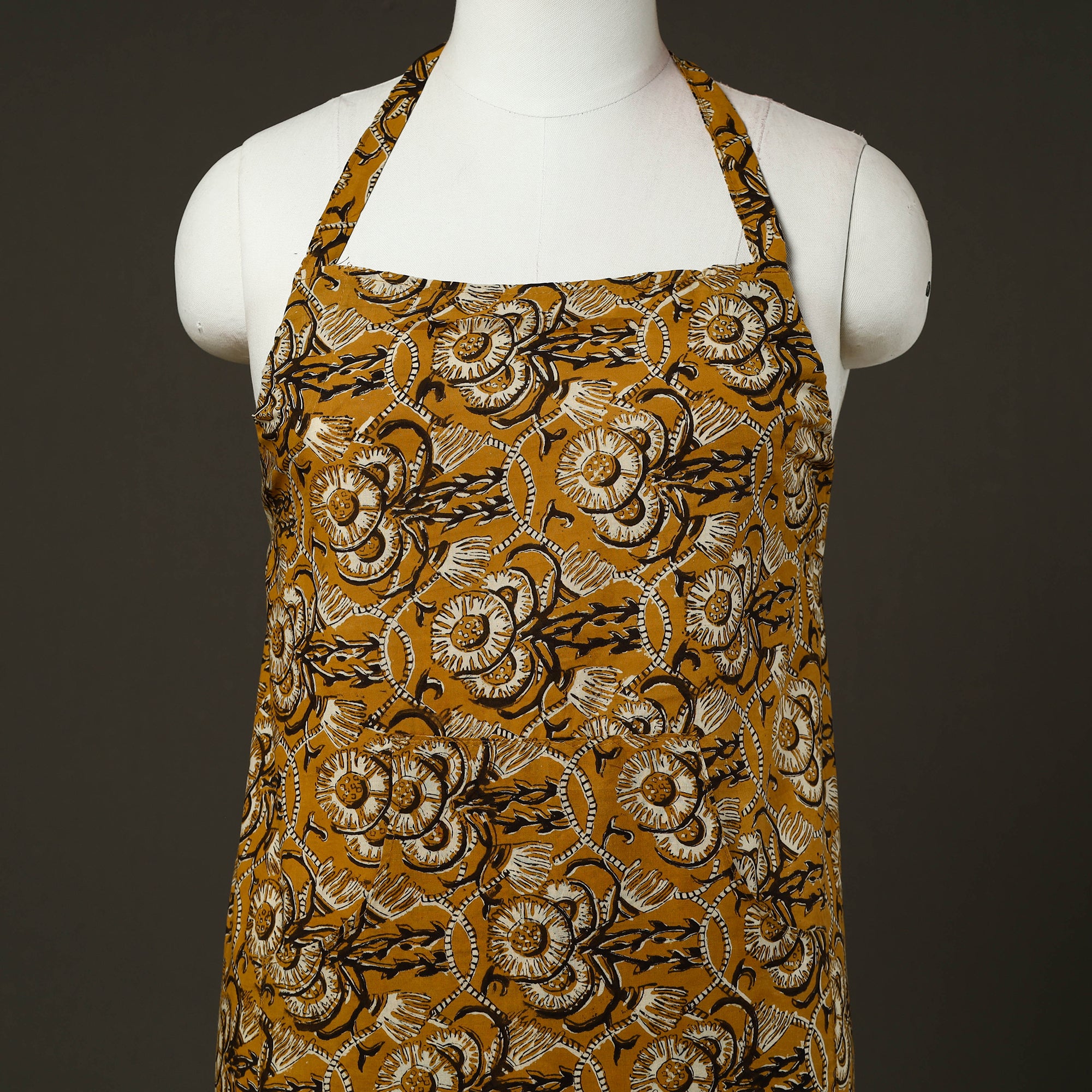 Upgrade your kitchen style with this yellow bagru block print cotton apron with pocket, featuring traditional hand-block printing techniques from Rajasthan. Made from soft, breathable cotton, it is lightweight. Designed to protect your clothing from splashes and spills, this handmade kitchen apron offers an adjustable neck strap and a front pocket for added convenience, making it ideal for daily cooking and baking.