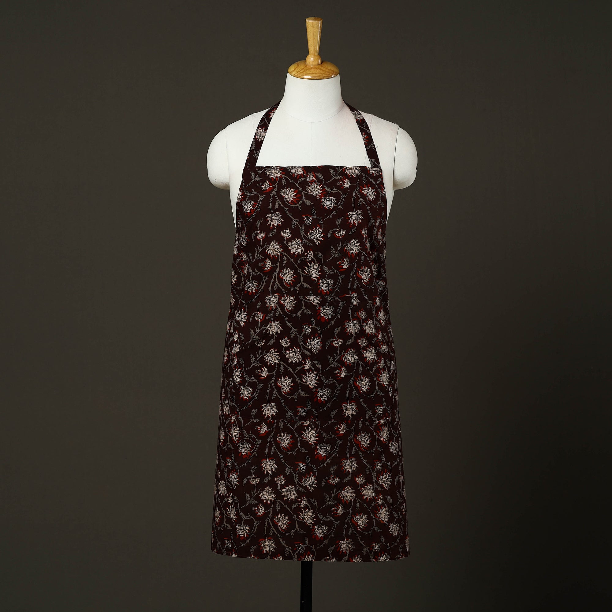 Upgrade your kitchen style with this brown bagru block print cotton apron with pocket, featuring traditional hand-block printing techniques from Rajasthan. Made from soft, breathable cotton, it is lightweight. Designed to protect your clothing from splashes and spills, this handmade kitchen apron offers an adjustable neck strap and a front pocket for added convenience, making it ideal for daily cooking and baking.