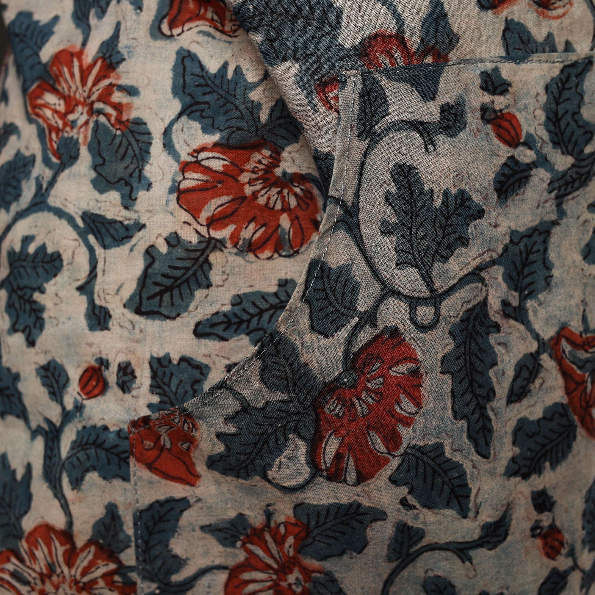 This beige bagru print cotton apron with pocket, crafted with traditional bagru block printing, combines cultural artistry with everyday functionality. Adorned with bagru prints, it features a convenient front pocket and adjustable straps for a comfortable fit. Perfect for cooking, baking, or grilling, this apron adds style and convenience to your kitchen essentials.