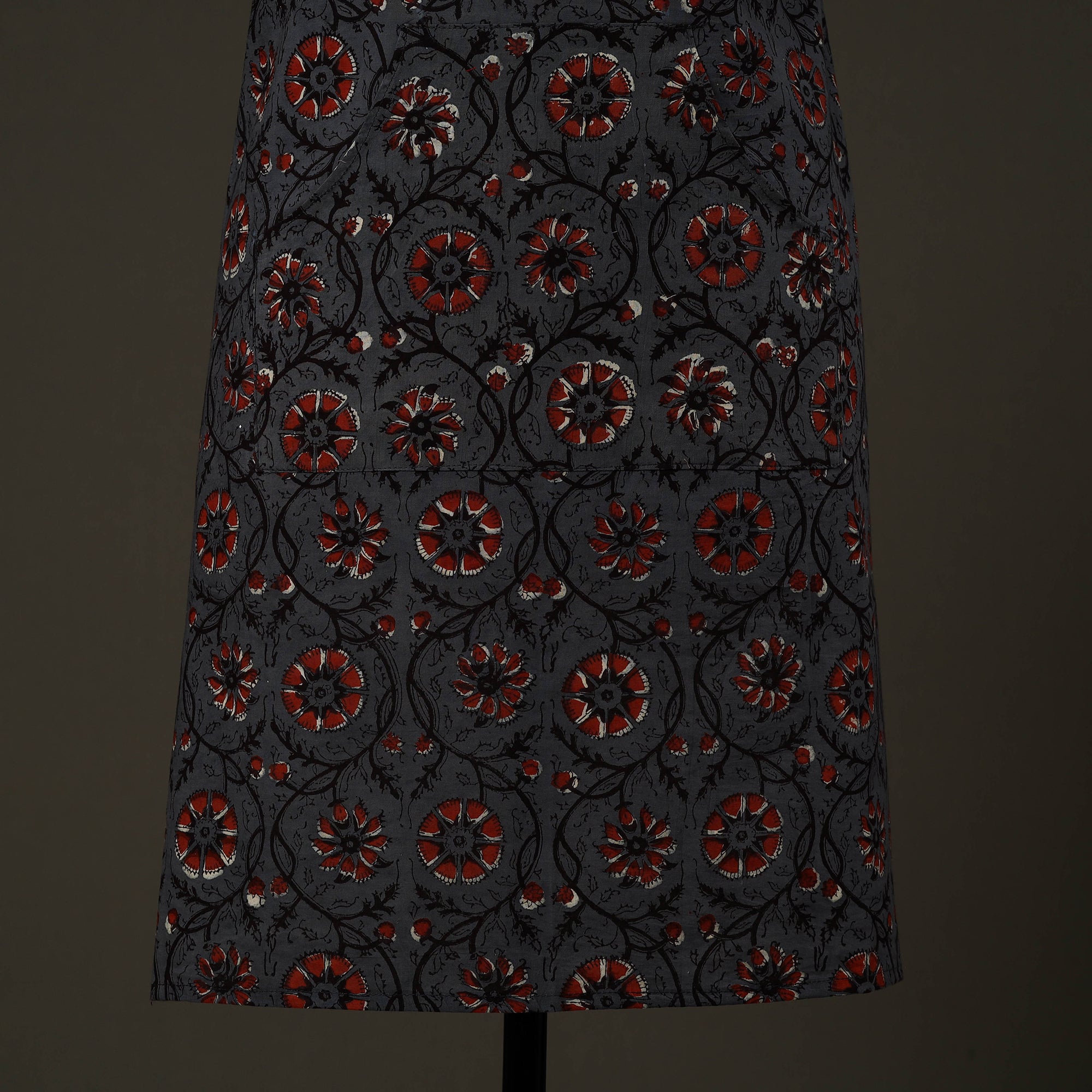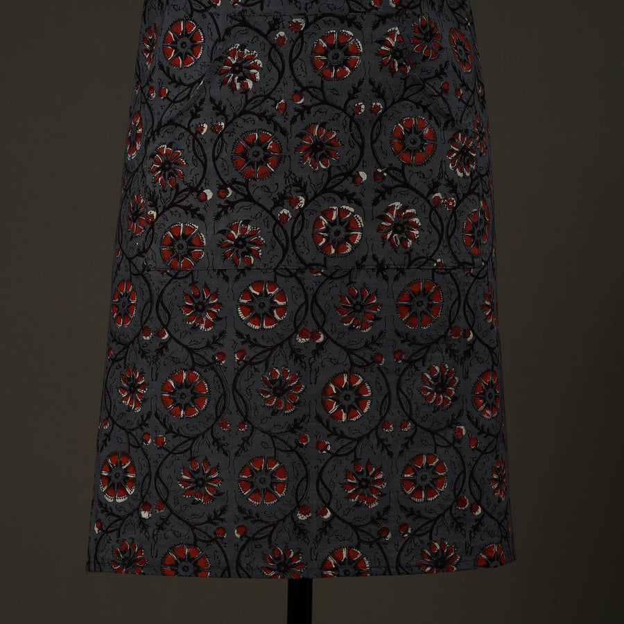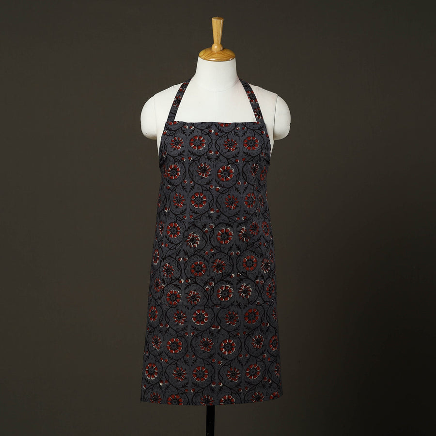 Upgrade your kitchen style with this dark grey bagru block print cotton apron with pocket, featuring traditional hand-block printing techniques from Rajasthan. Made from soft, breathable cotton, it is lightweight. Designed to protect your clothing from splashes and spills, this handmade kitchen apron offers an adjustable neck strap and a front pocket for added convenience, making it ideal for daily cooking and baking.