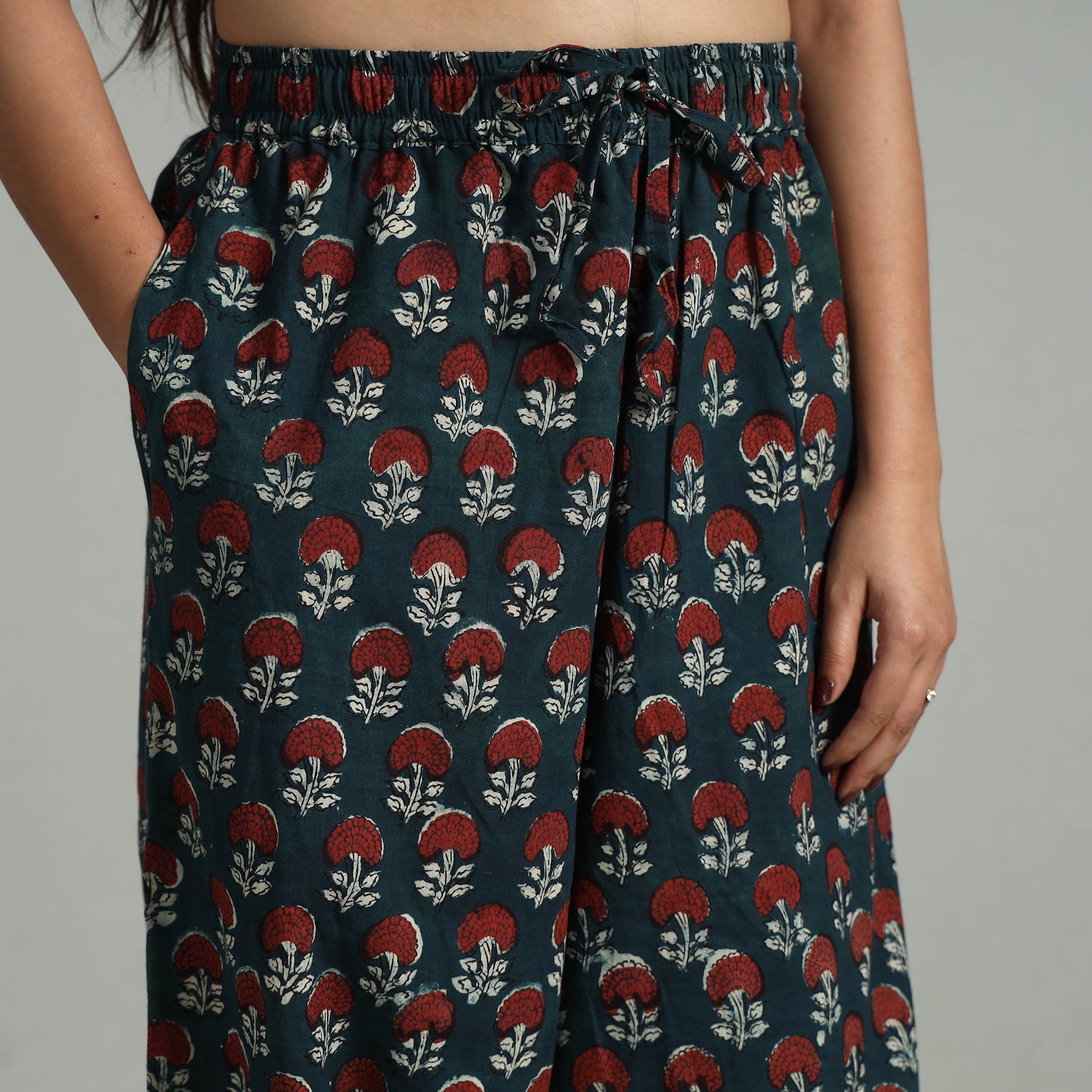 Bagru block print cotton elasticated harem pant. Crafted with natural dyes and elastic waist, it’s perfect for daily wear and special outings. This harem pant is inspired by traditional bagru techniques from Rajasthan, bringing cultural richness to your wardrobe. With two side pockets for added functionality, it combines style with convenience.