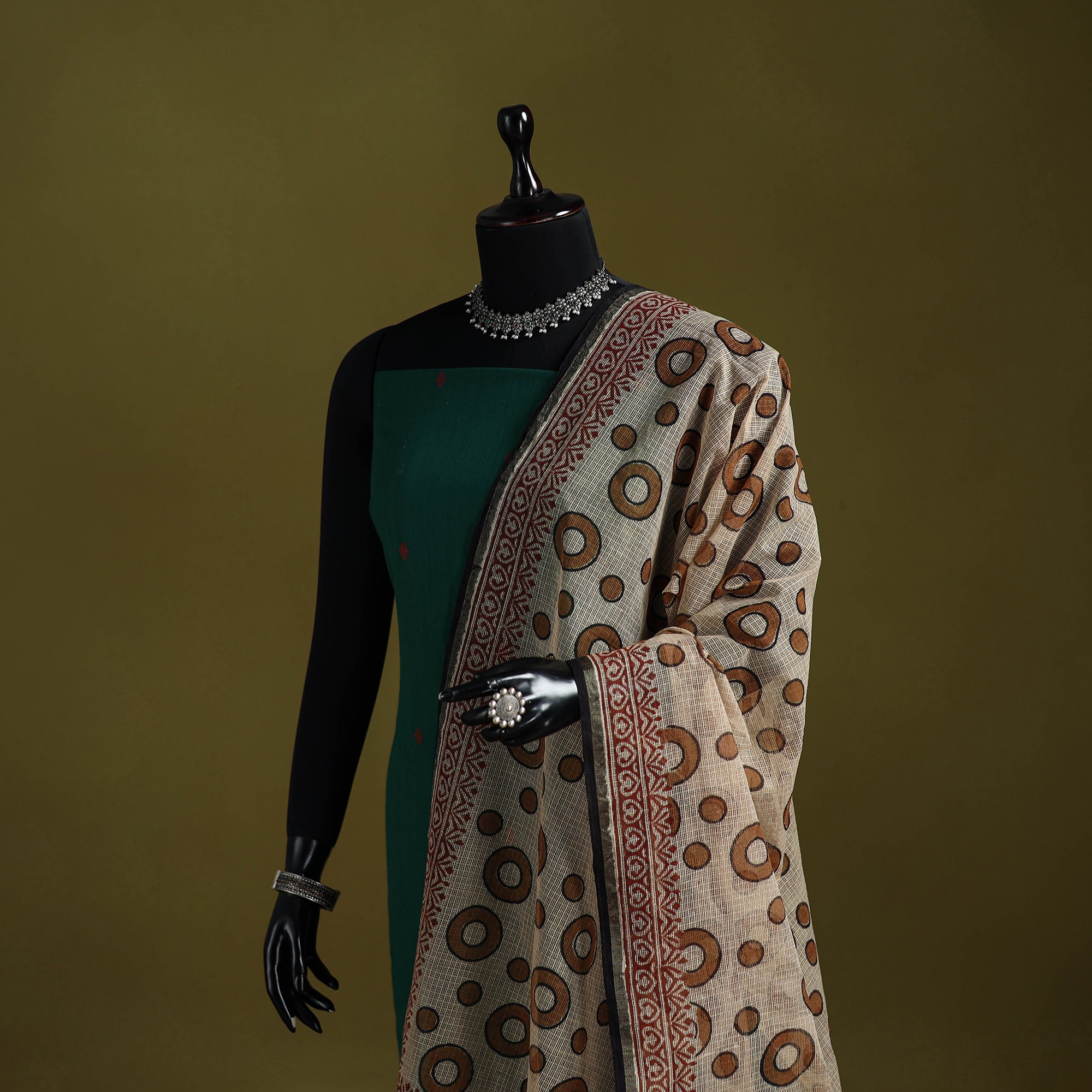 | Material | Brown bagru hand block print dupatta with zari border comes from the village of Bagru in Rajasthan, where artisans have practiced the mud-resist printing technique for over 400–450 years. Printed on kota doria cotton using hand carved wooden blocks with natural dyes. Kota doria is an age-old Indian textile produced in the Kota district of Rajasthan. The doria or the threads are finely interweaves to make the check patterns. Its lightweight and sheer texture giving an exquisite grace and elegance of its own. Perfect for both casual outings and everyday wear. A Note on Handmade Beauty |
