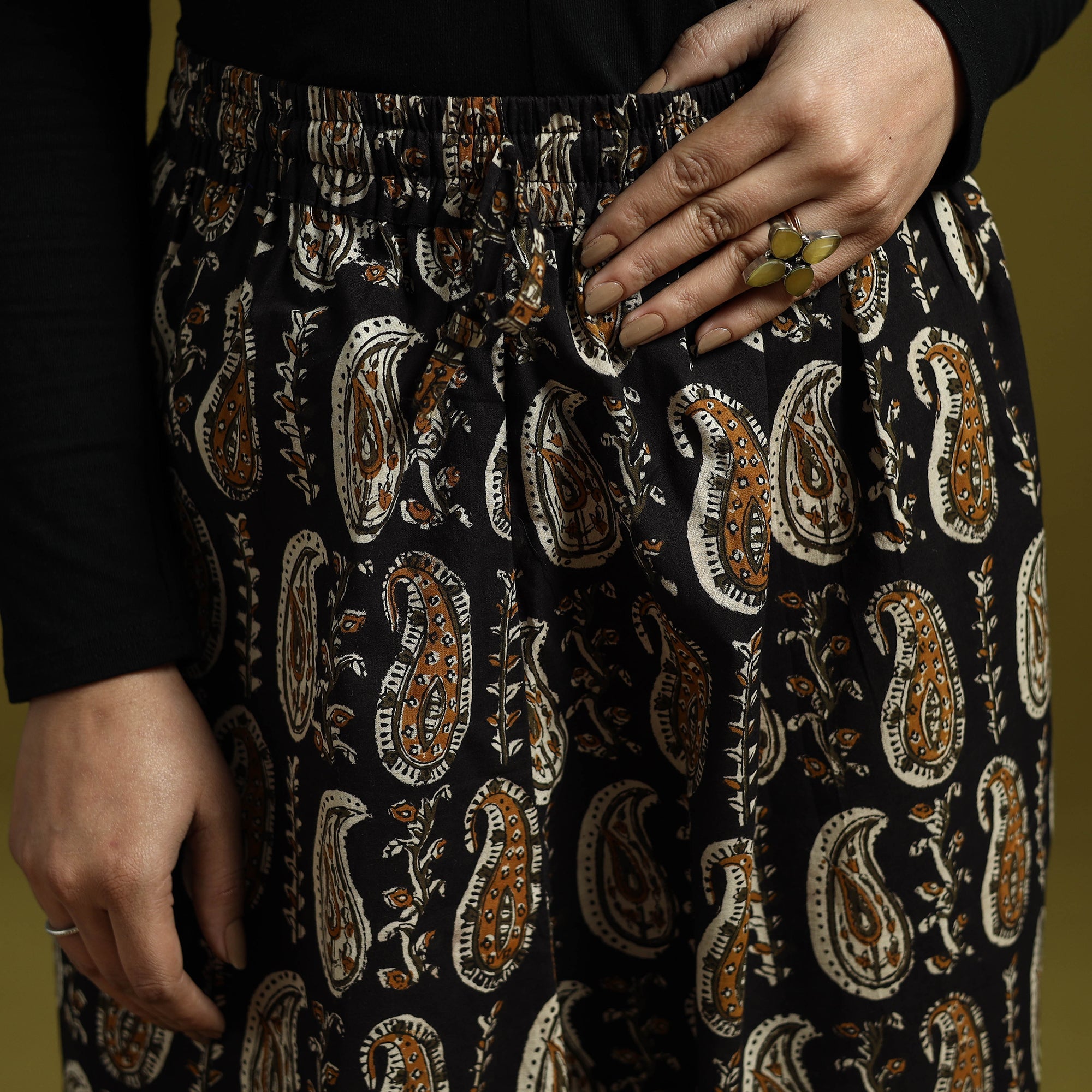 Add a touch of traditional charm to your wardrobe with this black bagru print women’s harem pant from Rajasthan, Bagru printing is known for its hand block designs and rich earthy tones created using natural dyes. The cotton fabric, elasticated waist with drawstring, and side pocket ensure all-day comfort and practicality. Pair it with tops or short kurtas for a relaxed yet elegant look.