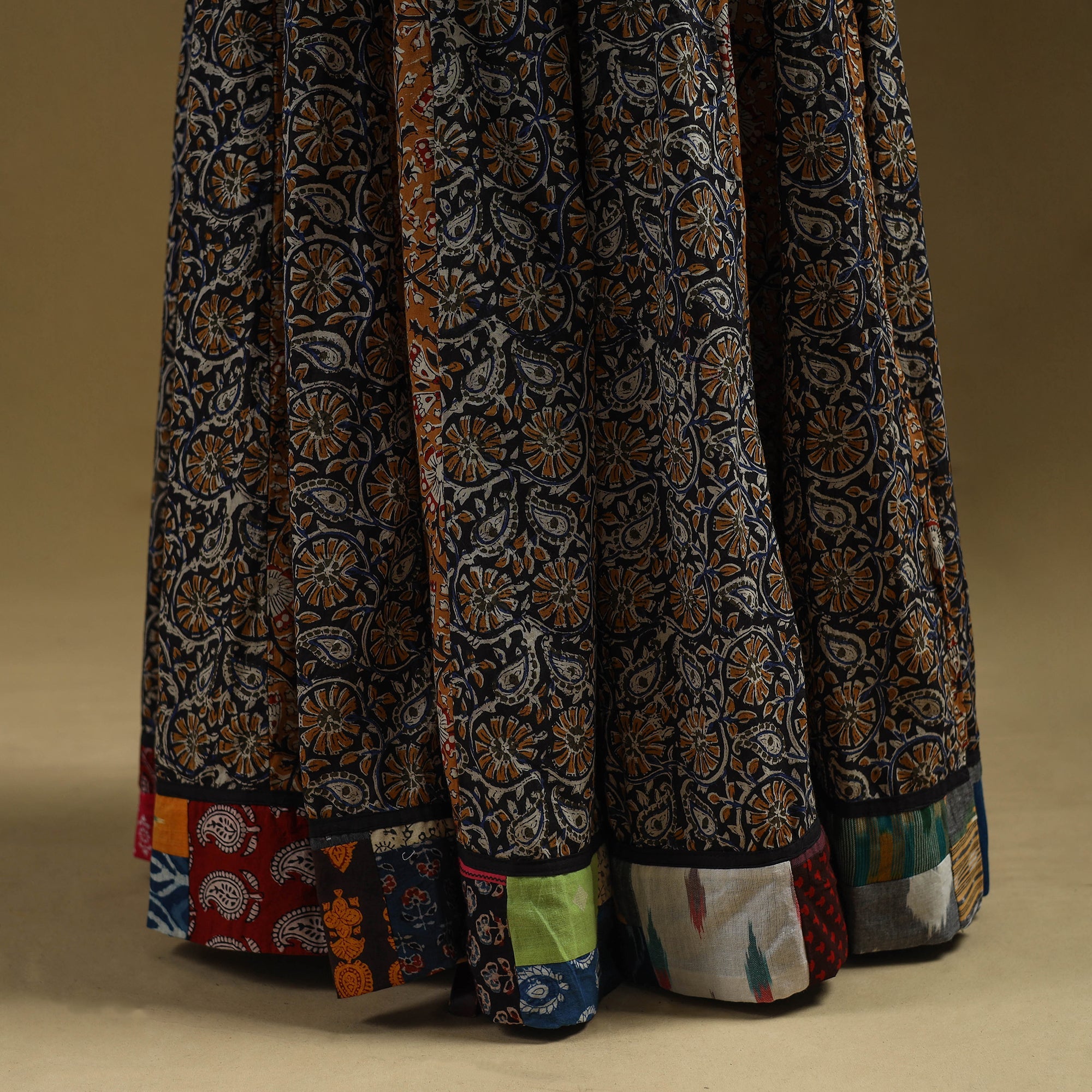 Bagru cotton patchwork long skirt offers an elasticated waist with a tie-up for a comfortable, adjustable fit. Created using the traditional hand block printing technique. 24 kali patchwork design add a unique touch. Perfect for daily wear, vacations or relaxed outings.