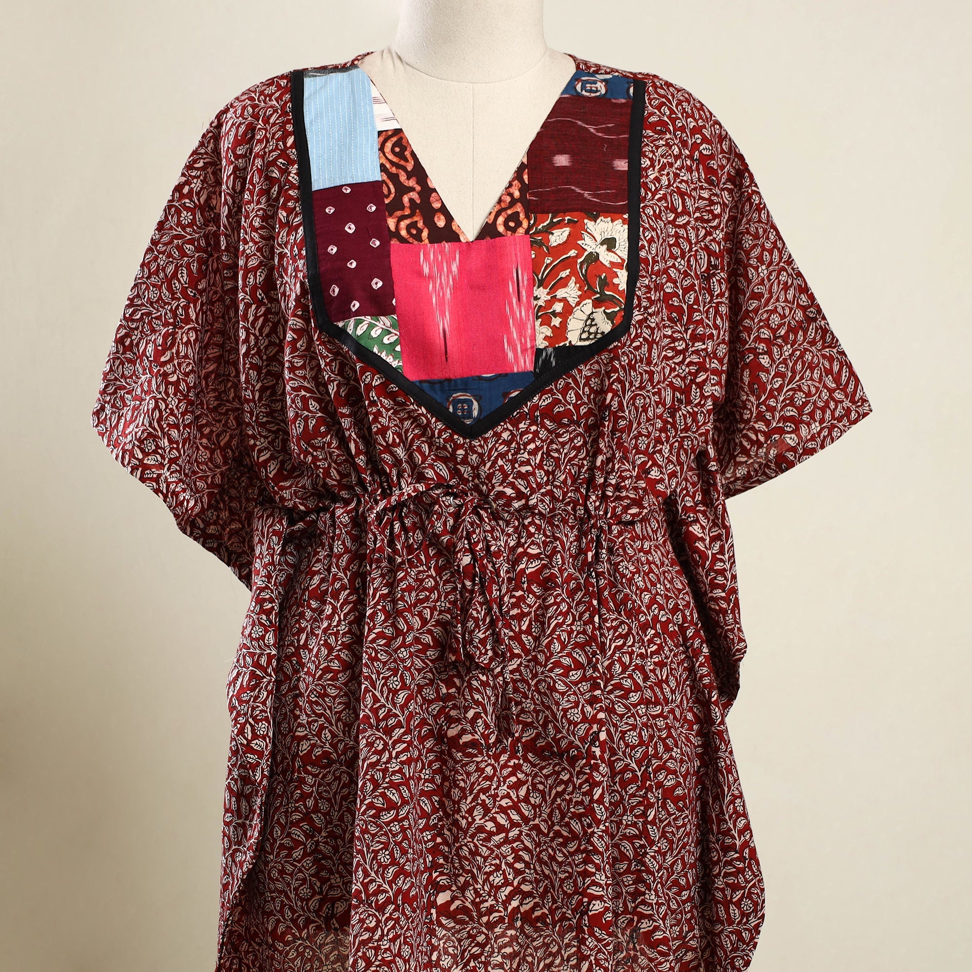 Enjoy effortless comfort in this red bagru block print patchwork kaftan. Made from soft, breathable cotton, it features a drawstring waist for an adjustable fit. Perfect for lounging at home or stepping out for casual outings, this kaftan offers a relaxed feel with just the right touch of style.