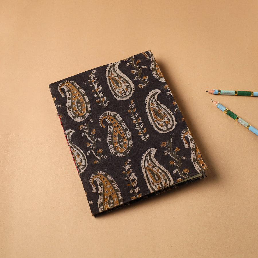 This brown handmade paper notebook features a hardbound bagru block-printed cotton fabric cover and is bound using traditional bookbinding techniques. The pages are crafted from recycled cotton and natural fibers, offering a sustainable and smooth writing surface. It's ideal for journaling, creative writing, or gifting.