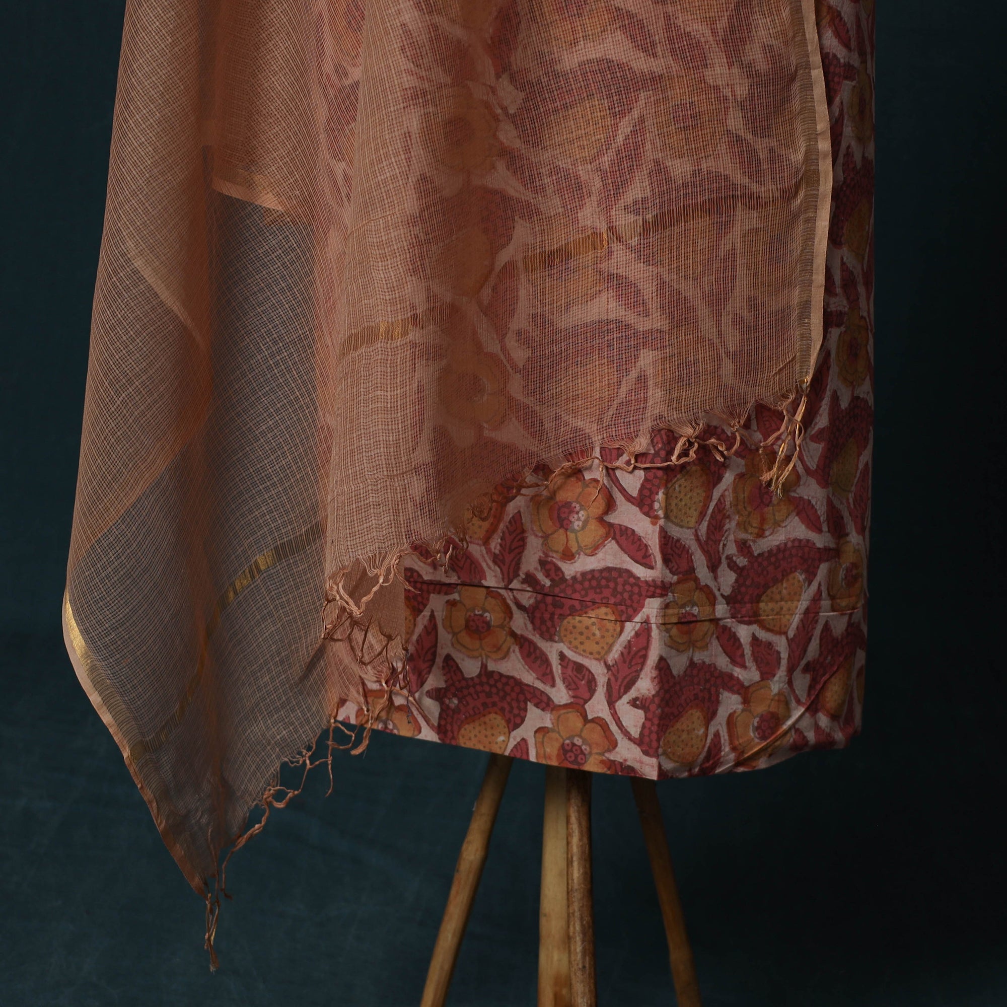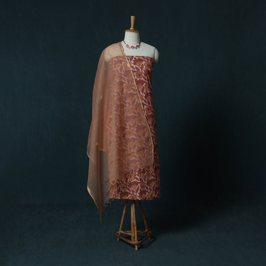 | Material | Bagru hand block print cotton 2pc unstitched dress material kurta set is crafted using the traditional mud-resist technique of Bagru, a town near Jaipur, Rajasthan. This craft is over 400–450 years old and is practiced by skilled artisans using hand-carved wooden blocks and natural dye processes. It is paired with a plain kota doria cotton dupatta, kota doria is an age-old Indian textile produced in the Kota district of Rajasthan. The doria or the threads are finely interweaves to make the check patterns. Its lightweight and sheer texture giving an exquisite grace and elegance of its own. This set also comes with handcrafted matching necklace and earrings to complete your look. It is suitable for festive gatherings, family functions, casual outing and everyday wear.