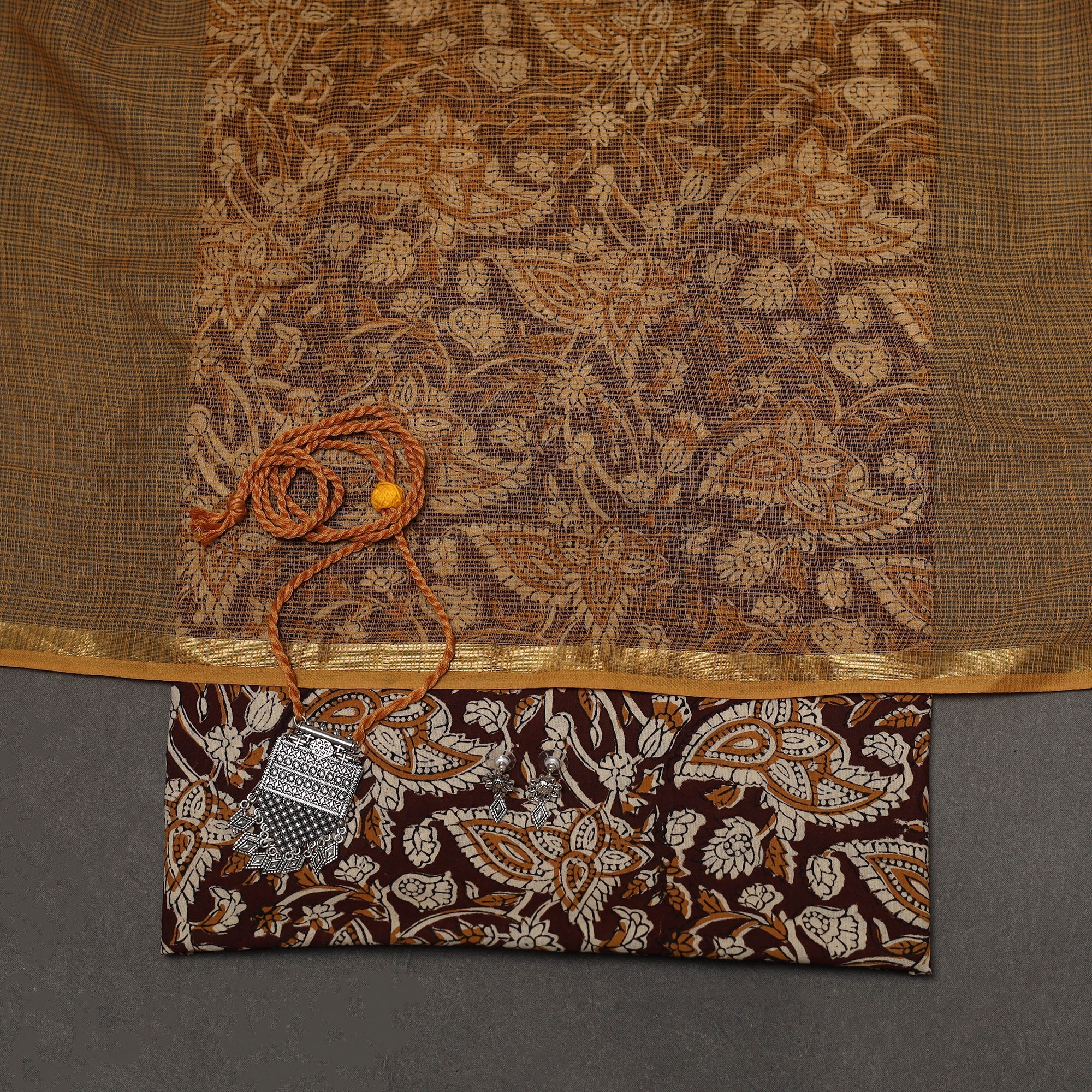 Bagru hand block print pure cotton 2pc unstitched dress material is crafted using the traditional mud-resist technique of Bagru, a town near Jaipur, Rajasthan. This craft is over 400–450 years old and is practiced by skilled artisans using hand-carved wooden blocks and natural dye processes. Paired with a plain kota doria cotton dupatta, the set also includes a handcrafted necklace and matching earrings, making it suitable for family gatherings, traditional events or special occasions.
