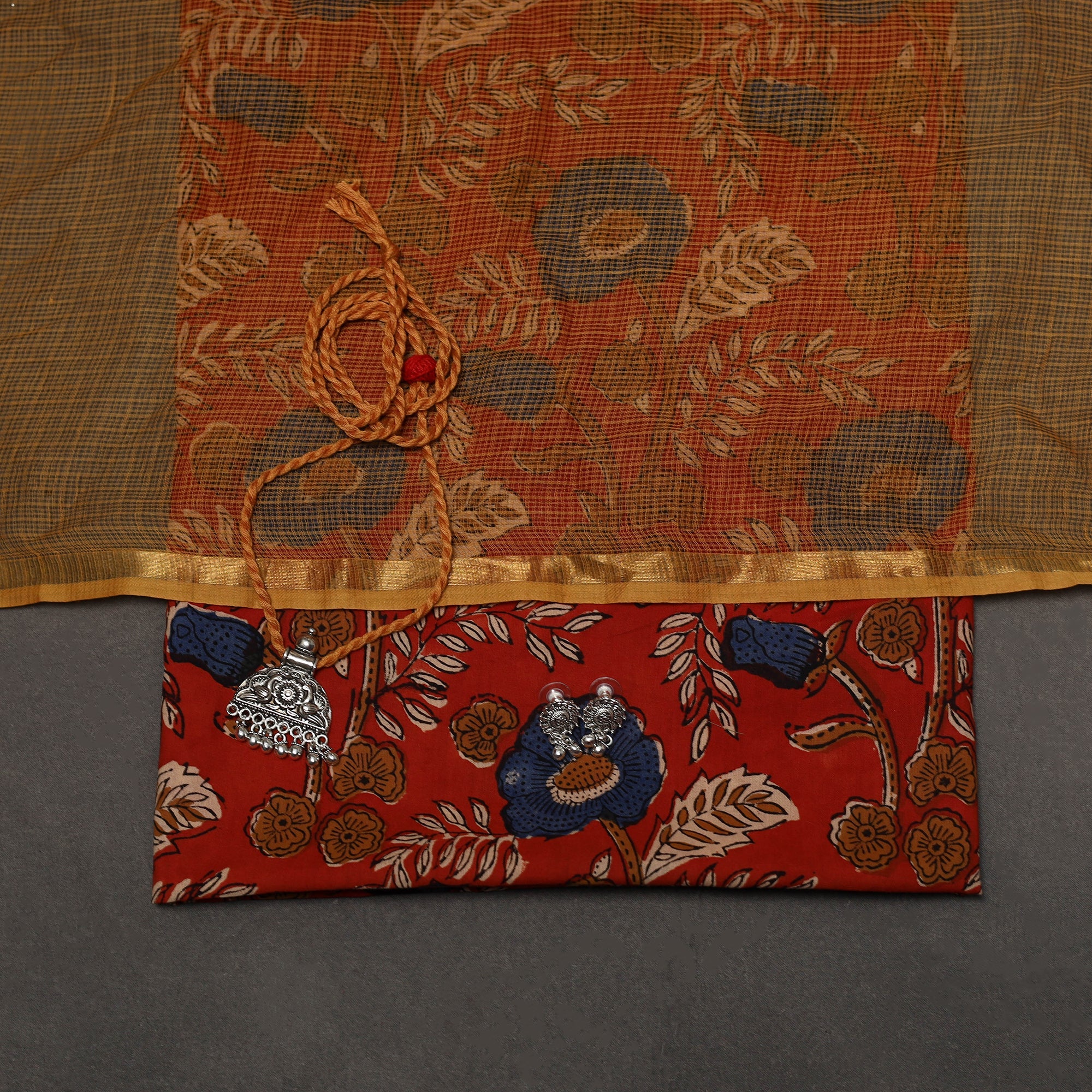 Bagru hand block print pure cotton 2pc unstitched dress material is crafted using the traditional mud-resist technique of Bagru, a town near Jaipur, Rajasthan. This craft is over 400–450 years old and is practiced by skilled artisans using hand-carved wooden blocks and natural dye processes. Paired with a plain kota doria cotton dupatta, the set also includes a handcrafted necklace and matching earrings, making it suitable for family gatherings, traditional events or special occasions.