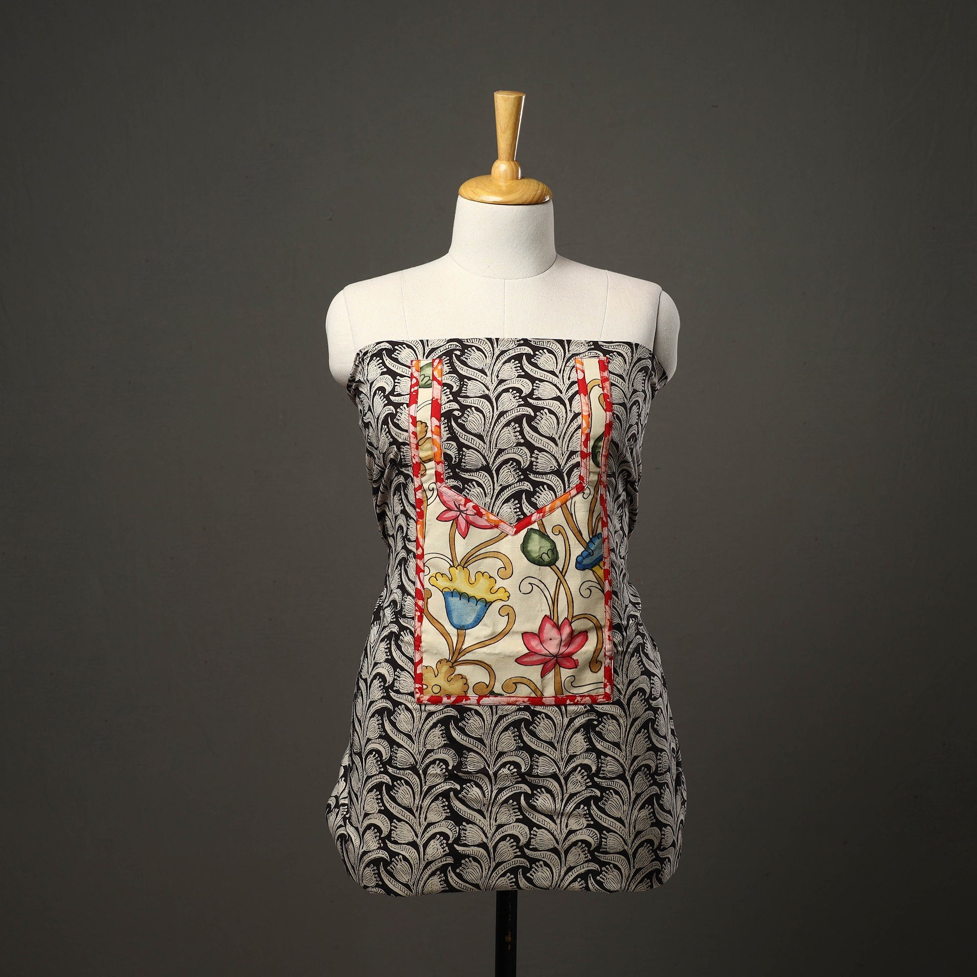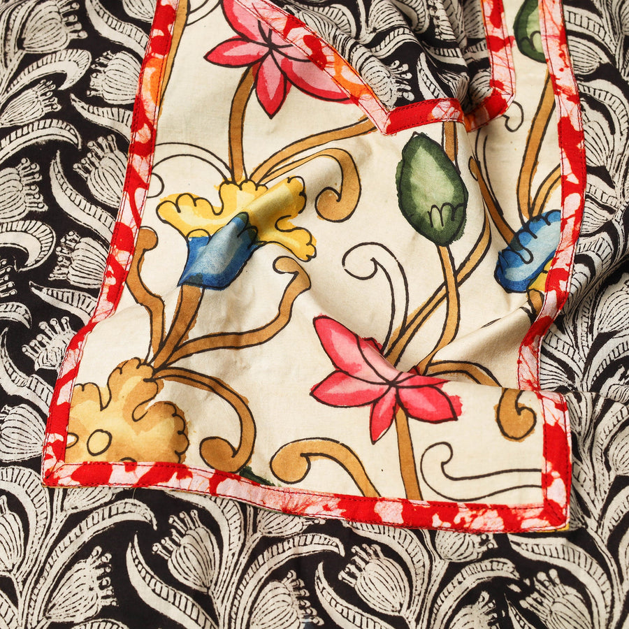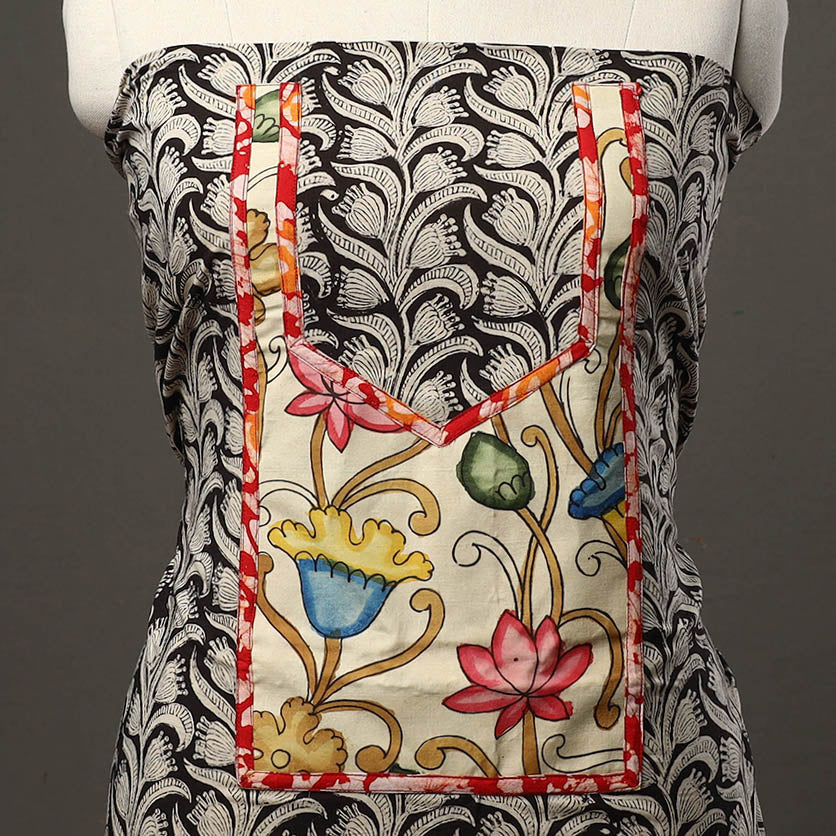 Experience the beauty of black bagru print cotton kurta material with patchwork. Using a traditional mud-resist technique, artisans from Bagru, Rajasthan, create intricate patterns with hand-carved wooden blocks.