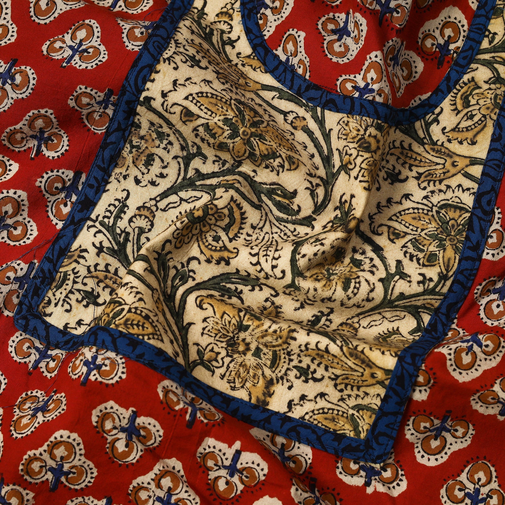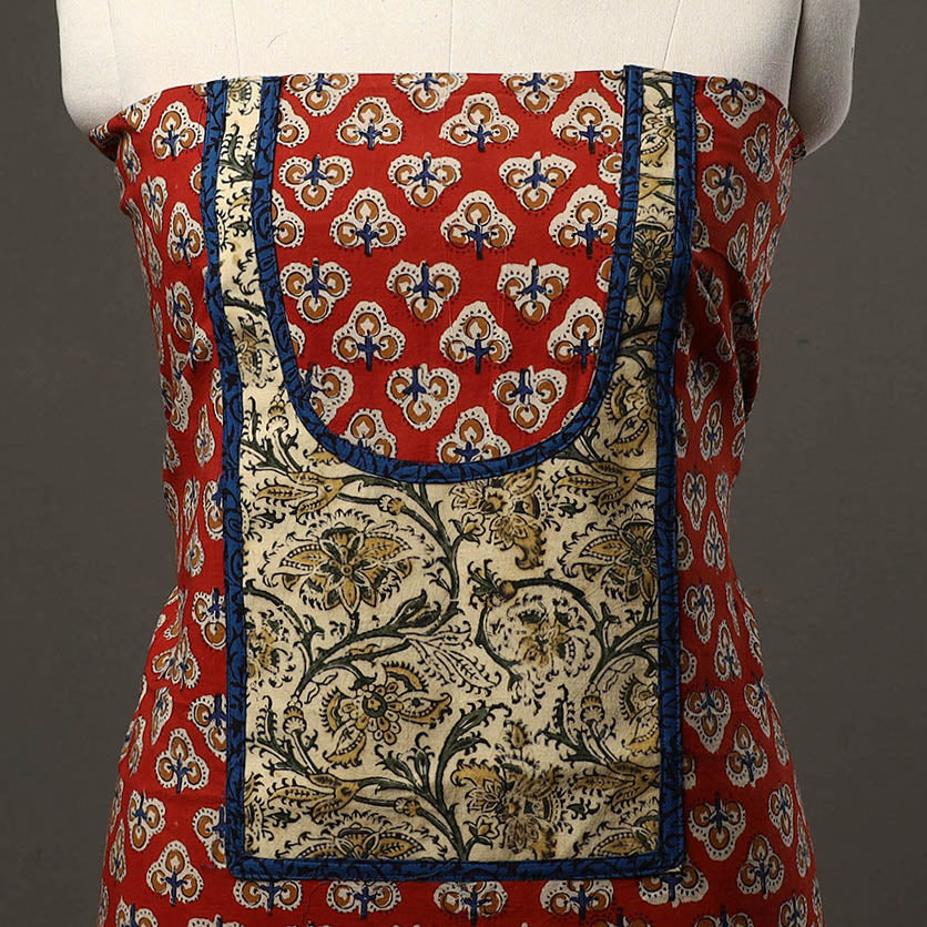 Experience the beauty of red bagru print cotton kurta material with patchwork. Using a traditional mud-resist technique, artisans from Bagru, Rajasthan, create intricate patterns with hand-carved wooden blocks.