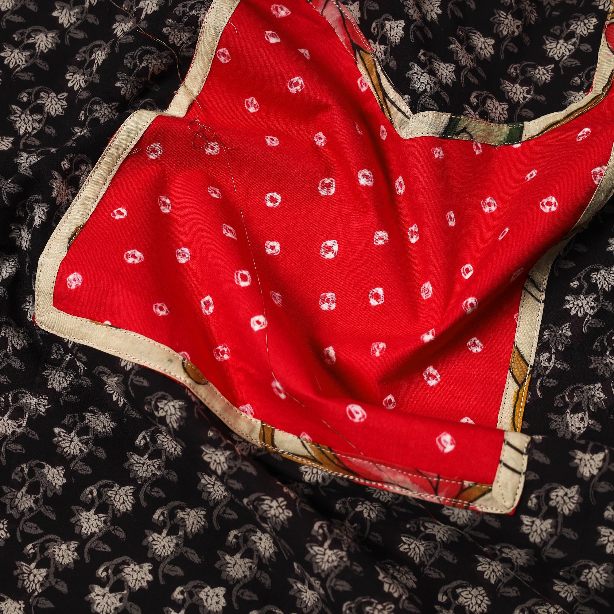 Experience the beauty of black bagru print cotton kurta material with patchwork. Using a traditional mud-resist technique, artisans from Bagru, Rajasthan, create intricate patterns with hand-carved wooden blocks.