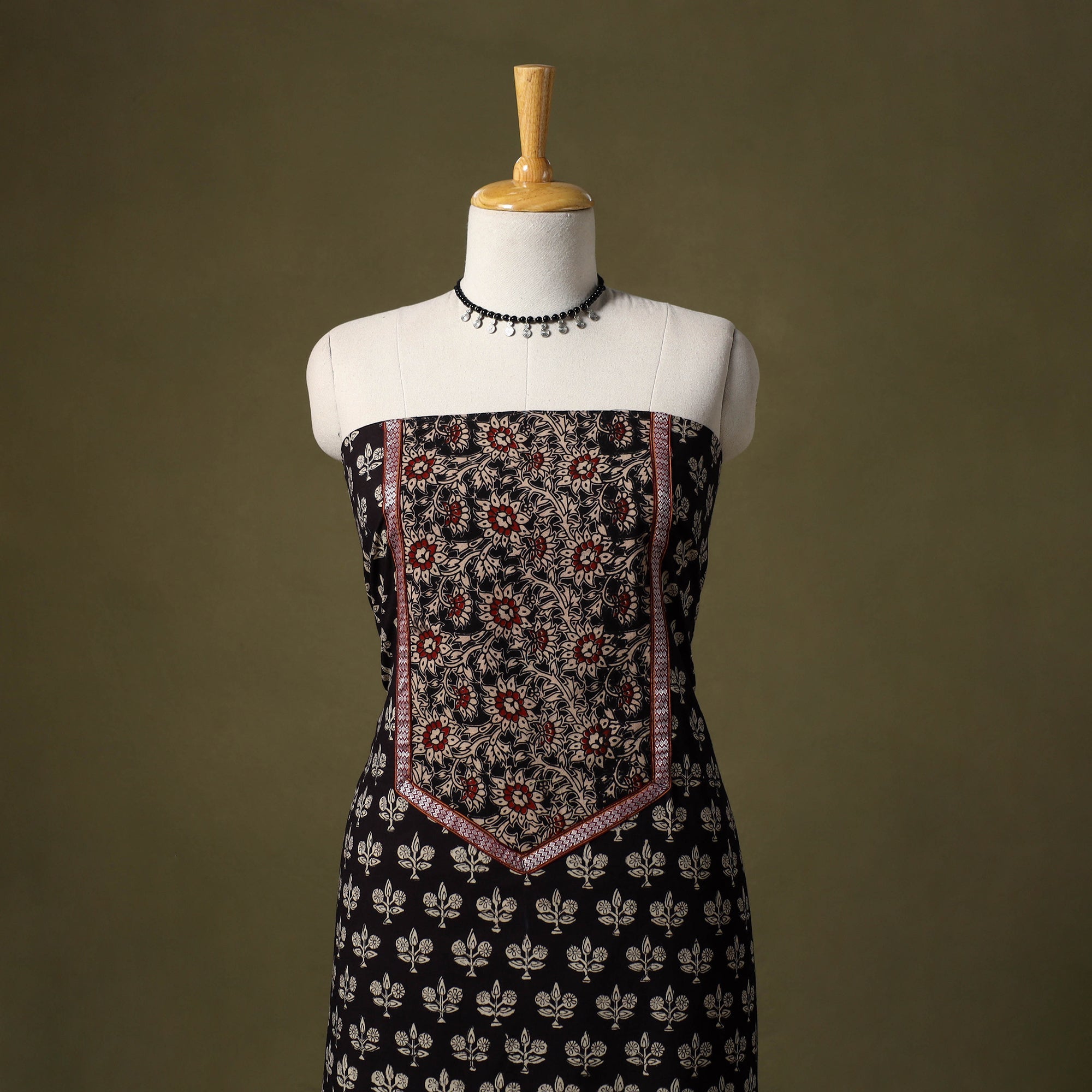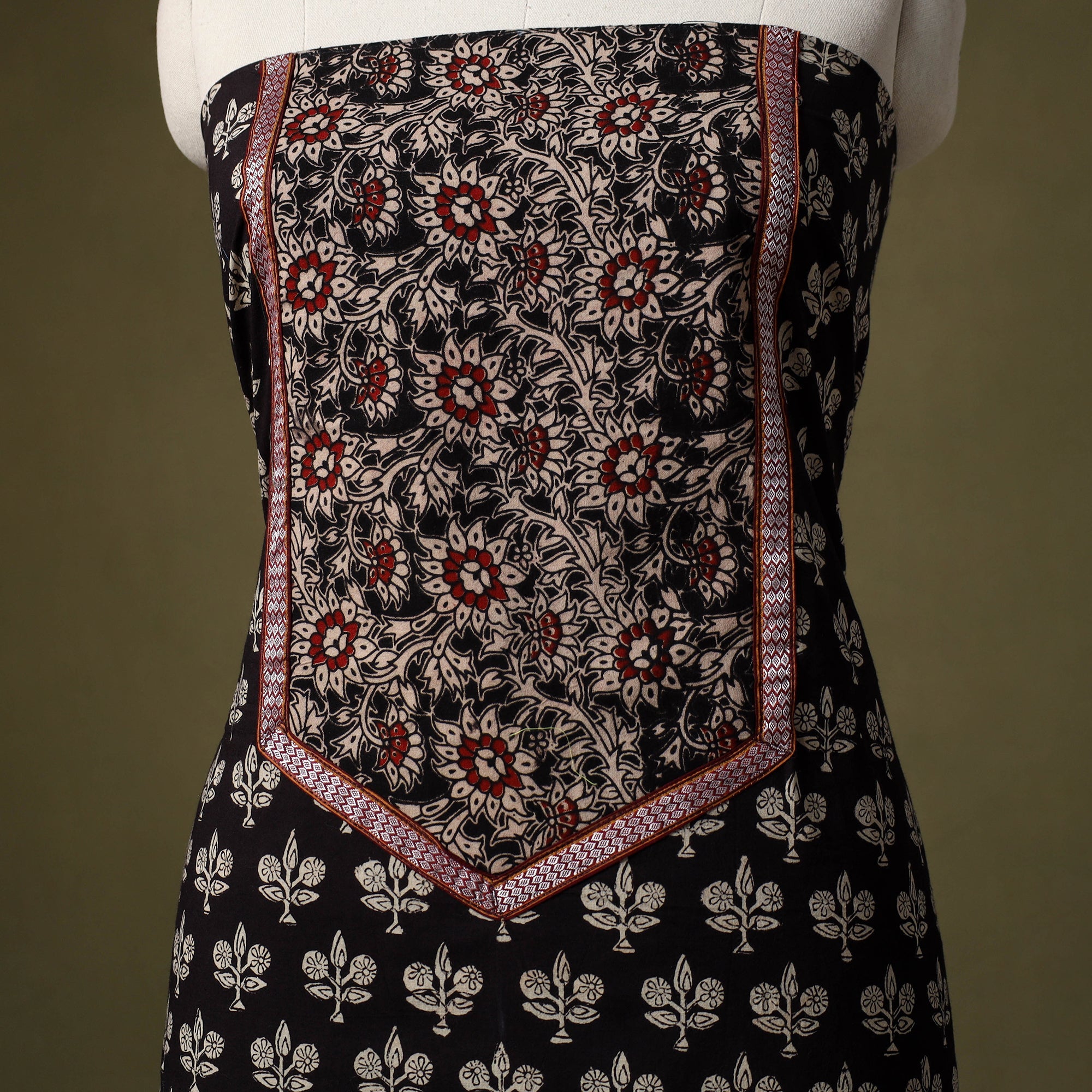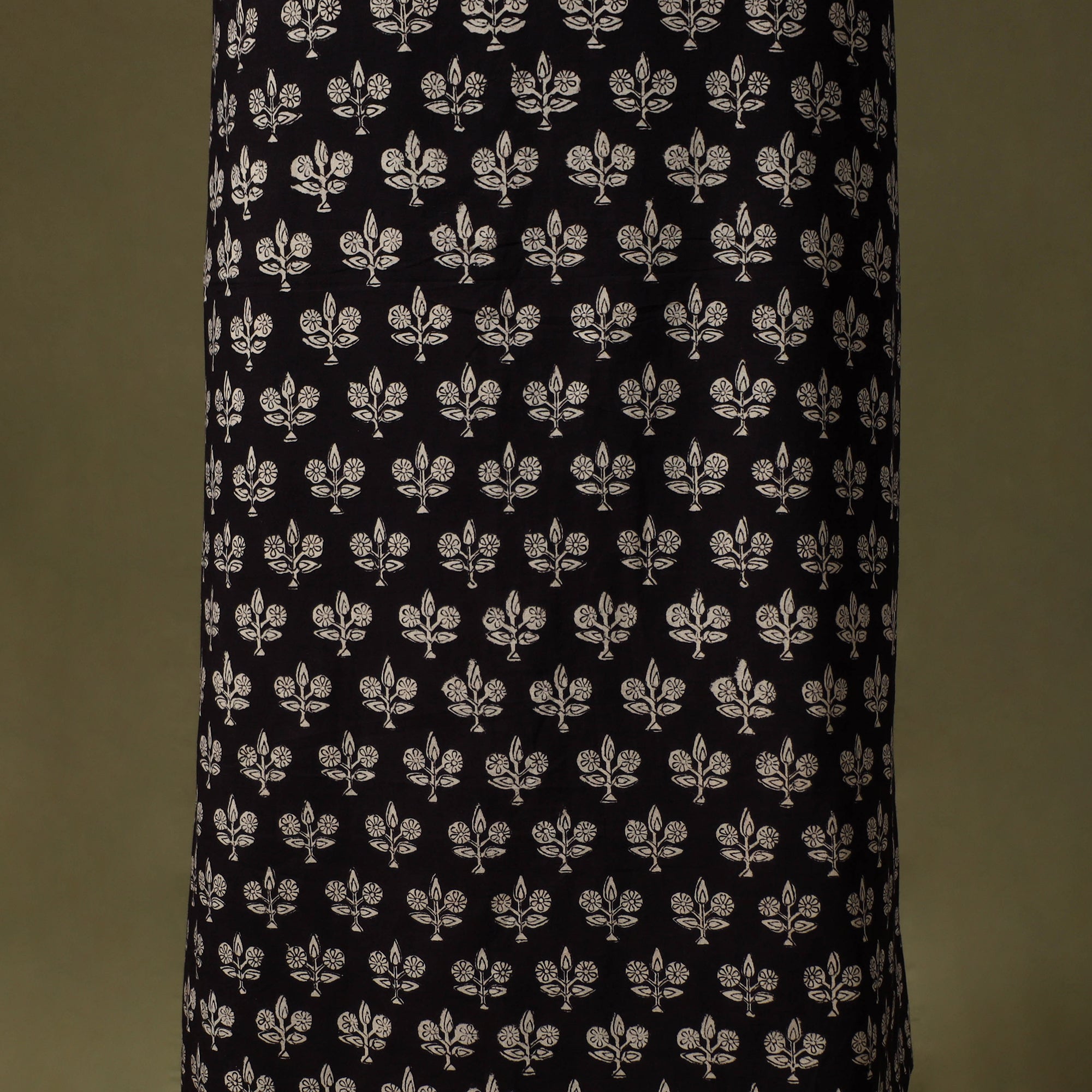 This black bagru hand block printed cotton kurta material is soft, breathable, and ideal for everyday wear. It features a handcrafted patchwork detail on the front neckline, offering a subtle touch of uniqueness. Perfect for daily kurtas, office looks, or casual outfits. Choose your preferred style and get it tailored your way.