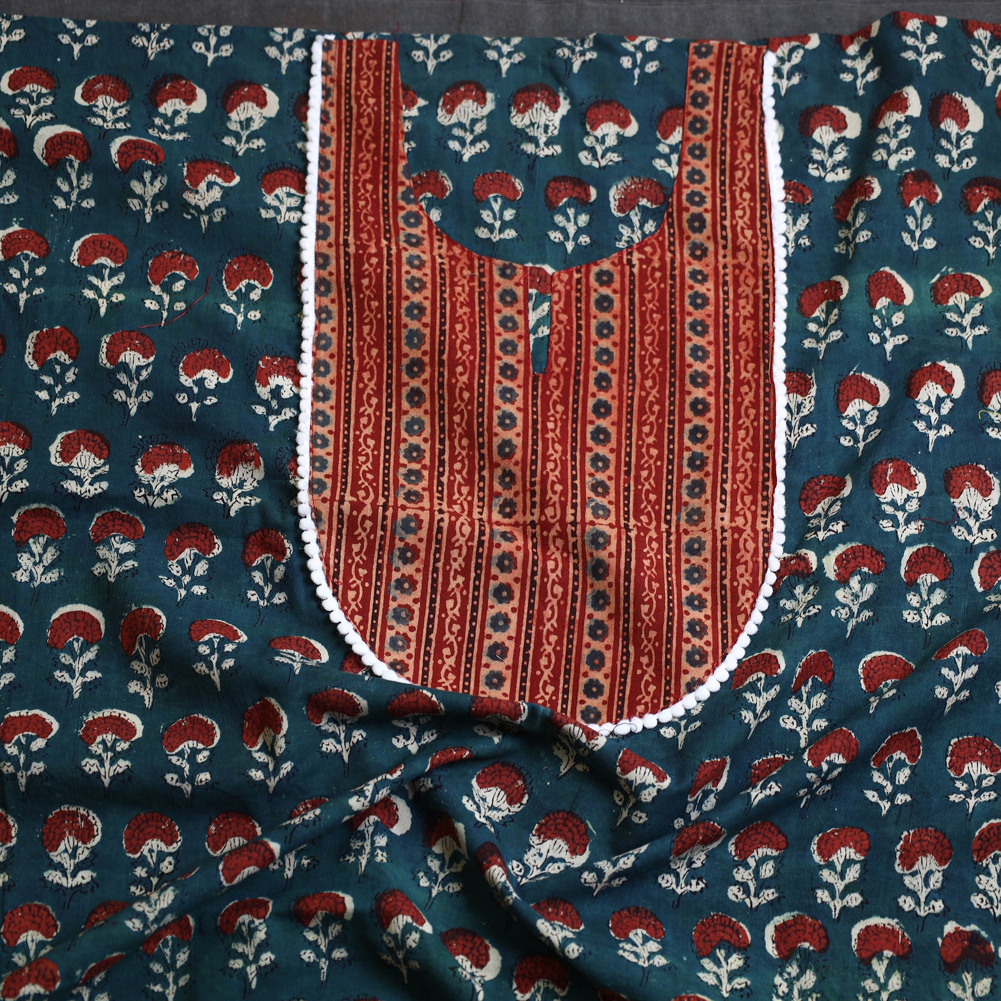 Add a cultural flair to your wardrobe with this green bagru block print cotton kurta fabric. The patchwork design and rich detailing bring alive age-old artistry. Perfect for making kurtas that are as stylish as they are rooted in heritage, this fabric ensures comfort, vibrancy, and timeless appeal.