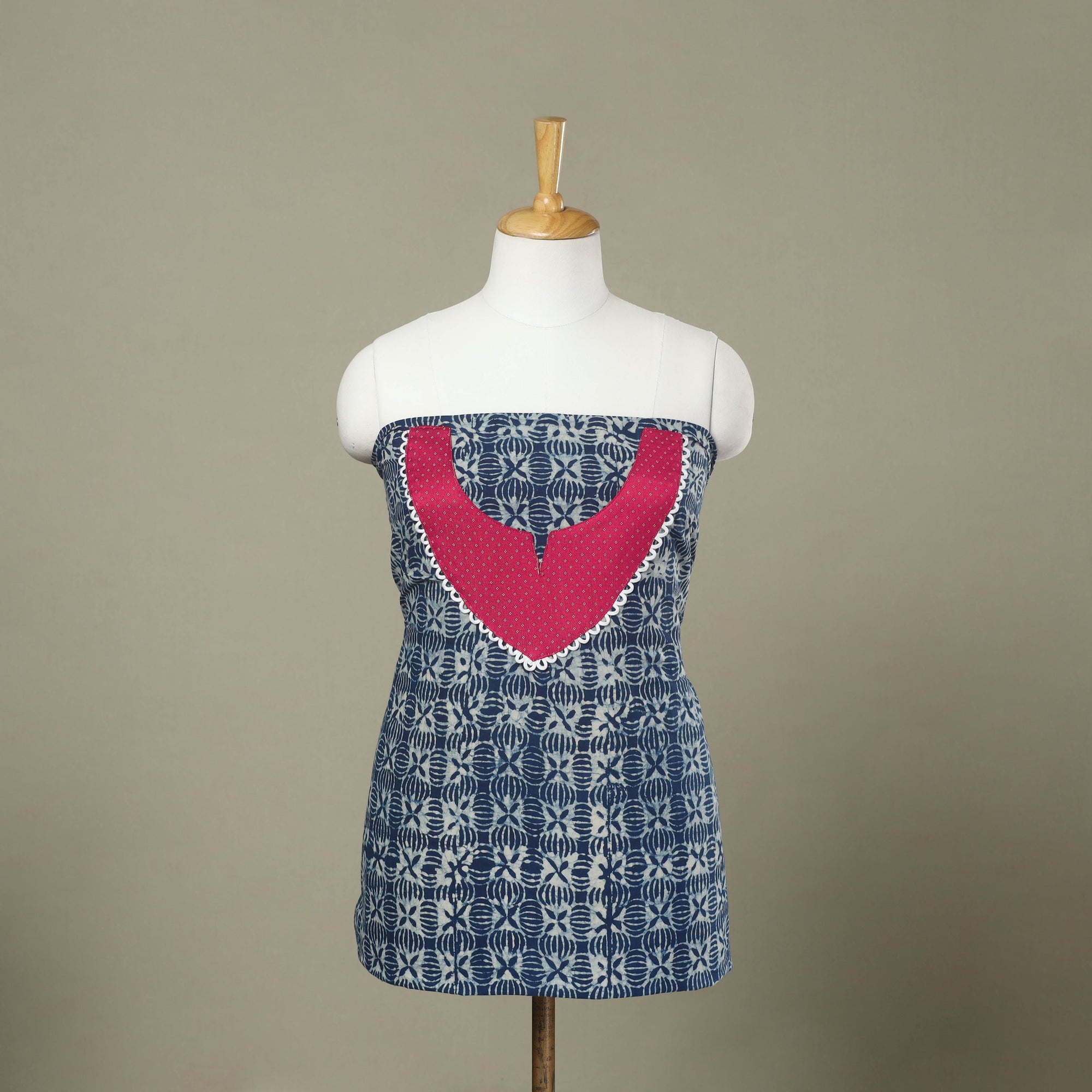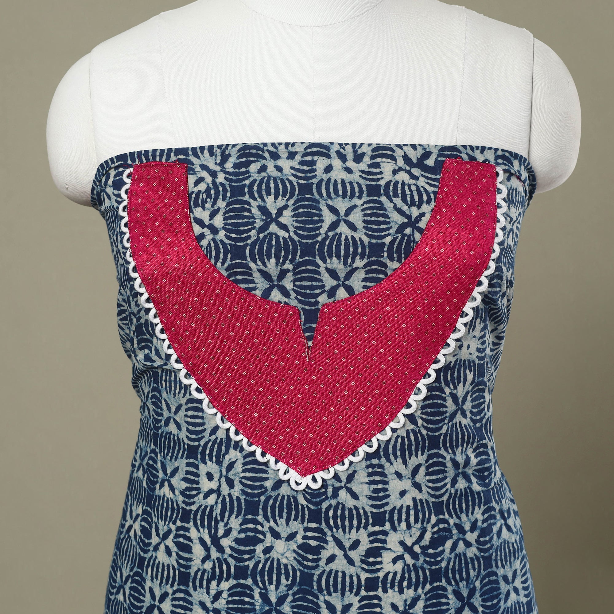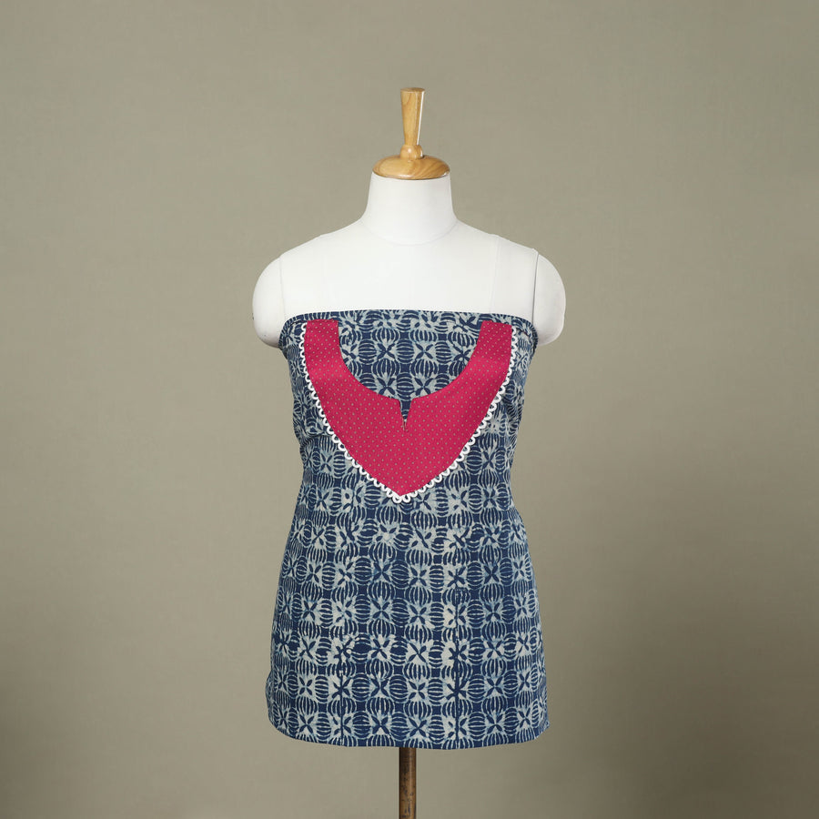 This blue bagru print patchwork cotton kurta material is crafted using the traditional block printing method. The fabric features vibrant, intricate patterns that reflect the region's artistic legacy. Soft, breathable cotton ensures comfort while adding a cultural touch to your wardrobe. It’s perfect for creating custom kurtas.