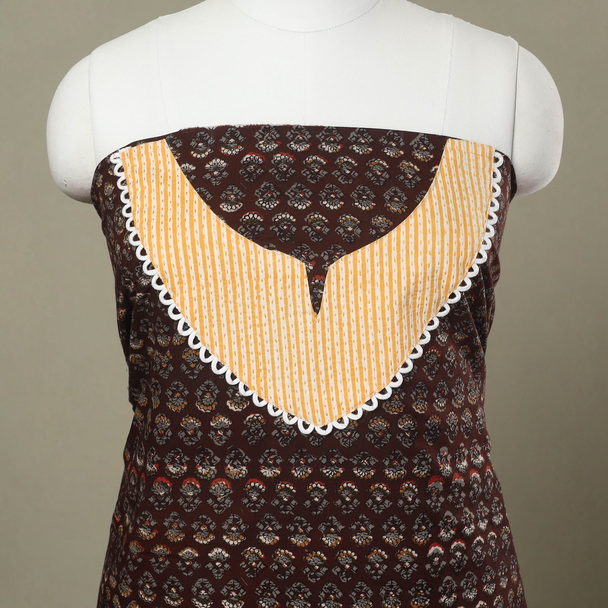 This brown bagru print patchwork cotton kurta material is crafted using the traditional block printing method. The fabric features vibrant, intricate patterns that reflect the region's artistic legacy. Soft, breathable cotton ensures comfort while adding a cultural touch to your wardrobe. It’s perfect for creating custom kurtas.