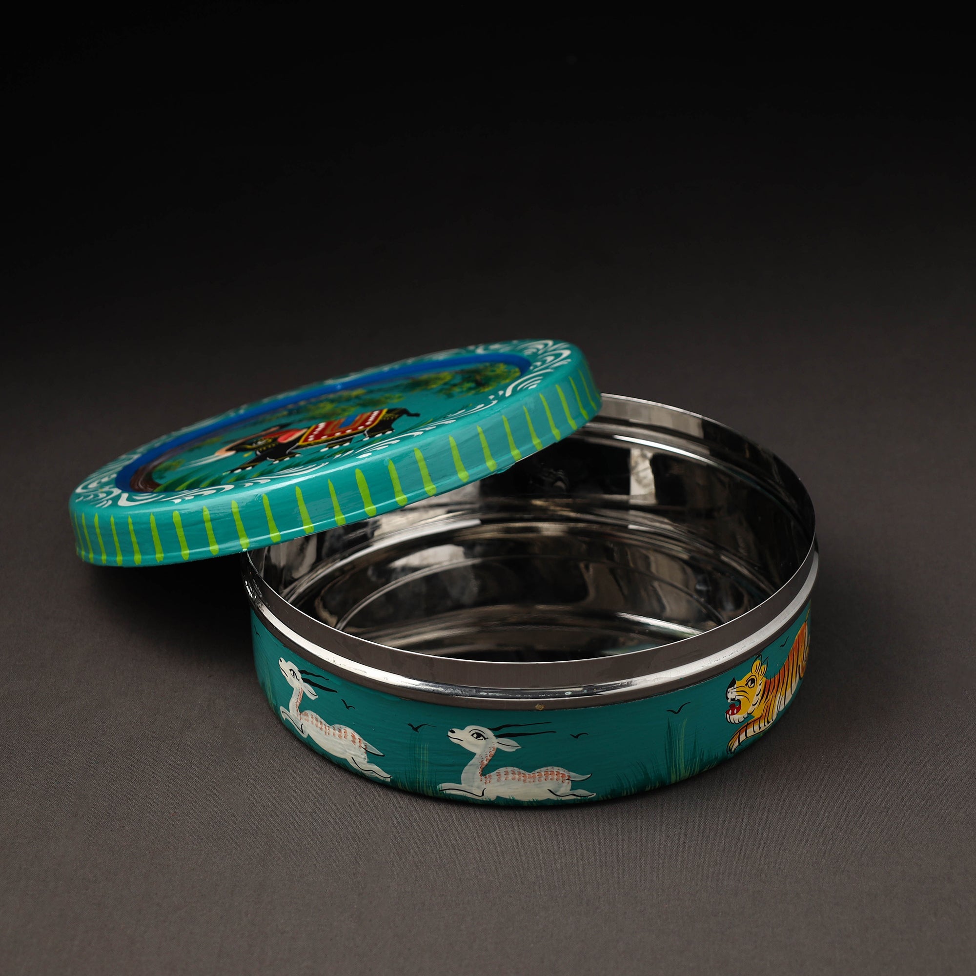 Add a touch of banaras craftsmanship to your kitchen with this green banaras handpainted stainless steel roti box. Made from durable steel, it features intricate, waterproof, oil-based painting by skilled artisans. Designed to keep rotis fresh and warm, this box combines functionality with artistry, making it a perfect addition to your dining essentials.