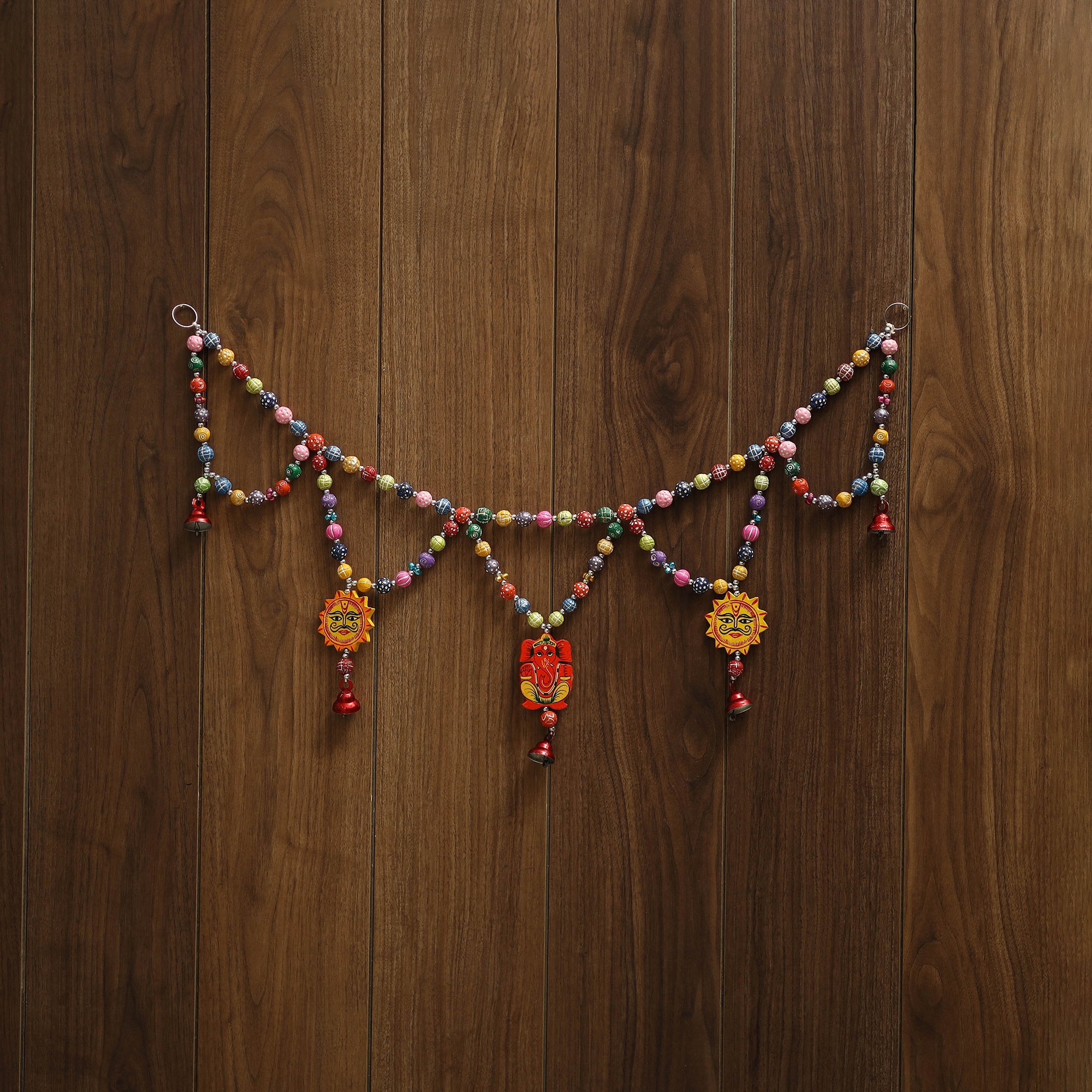 Bring home a festive charm with this traditional toran handcrafted by Devendra Singh from Banaras. Painted in rich waterproof oil paints, it showcases a blend of wooden, terracotta, and plastic beads enhanced with jingling metal bells. Designed with patience and skill, it turns any wall into a lively space full of warmth. An ideal decor detail that greets your guests with style and cultural elegance.