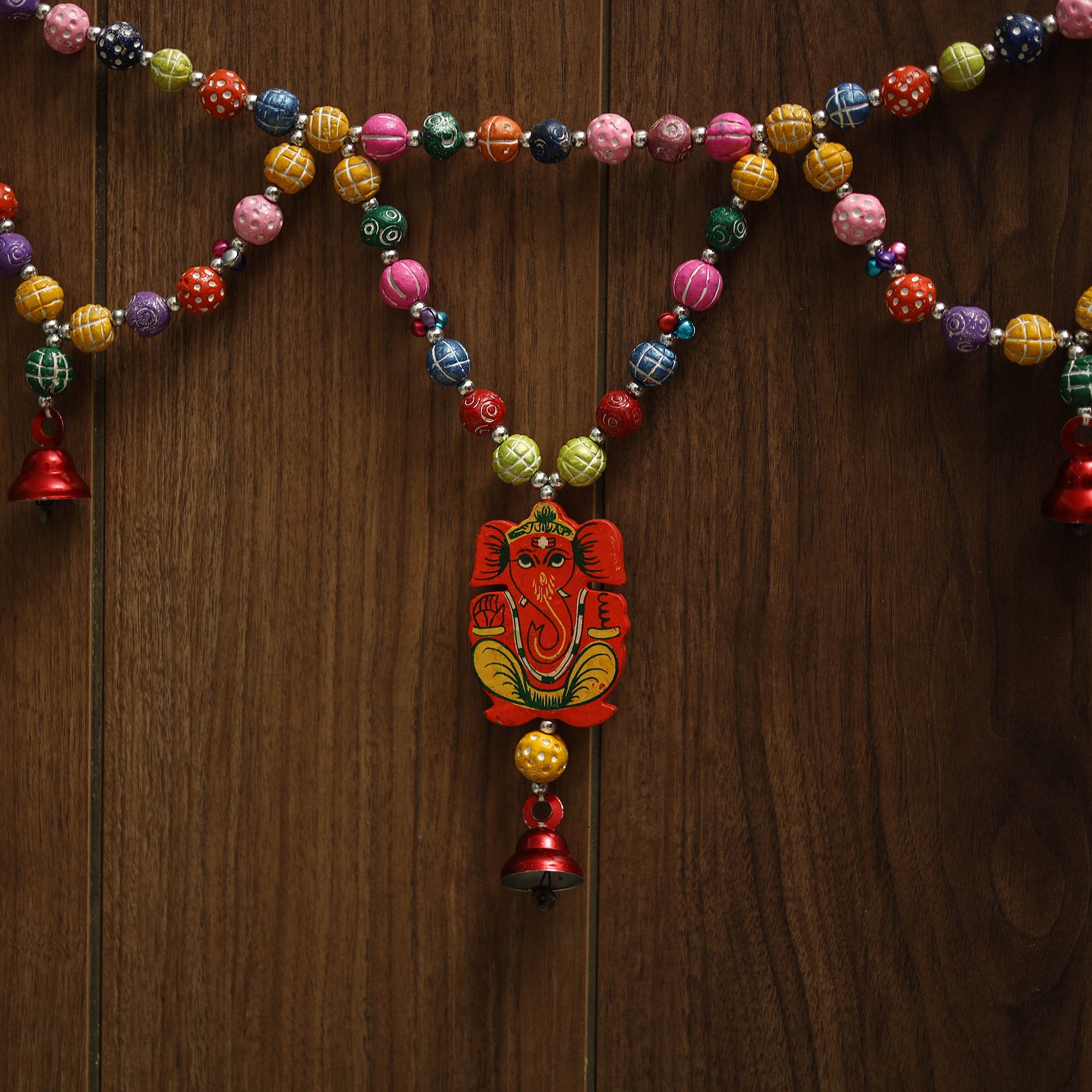 Bring home a festive charm with this traditional toran handcrafted by Devendra Singh from Banaras. Painted in rich waterproof oil paints, it showcases a blend of wooden, terracotta, and plastic beads enhanced with jingling metal bells. Designed with patience and skill, it turns any wall into a lively space full of warmth. An ideal decor detail that greets your guests with style and cultural elegance.