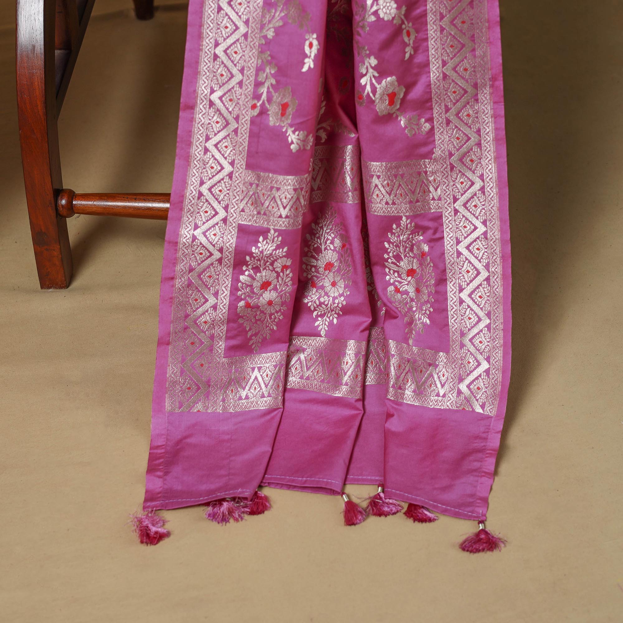 Beige - Brocade Handloom Pure Silk Banarasi Stole with Tassels 11