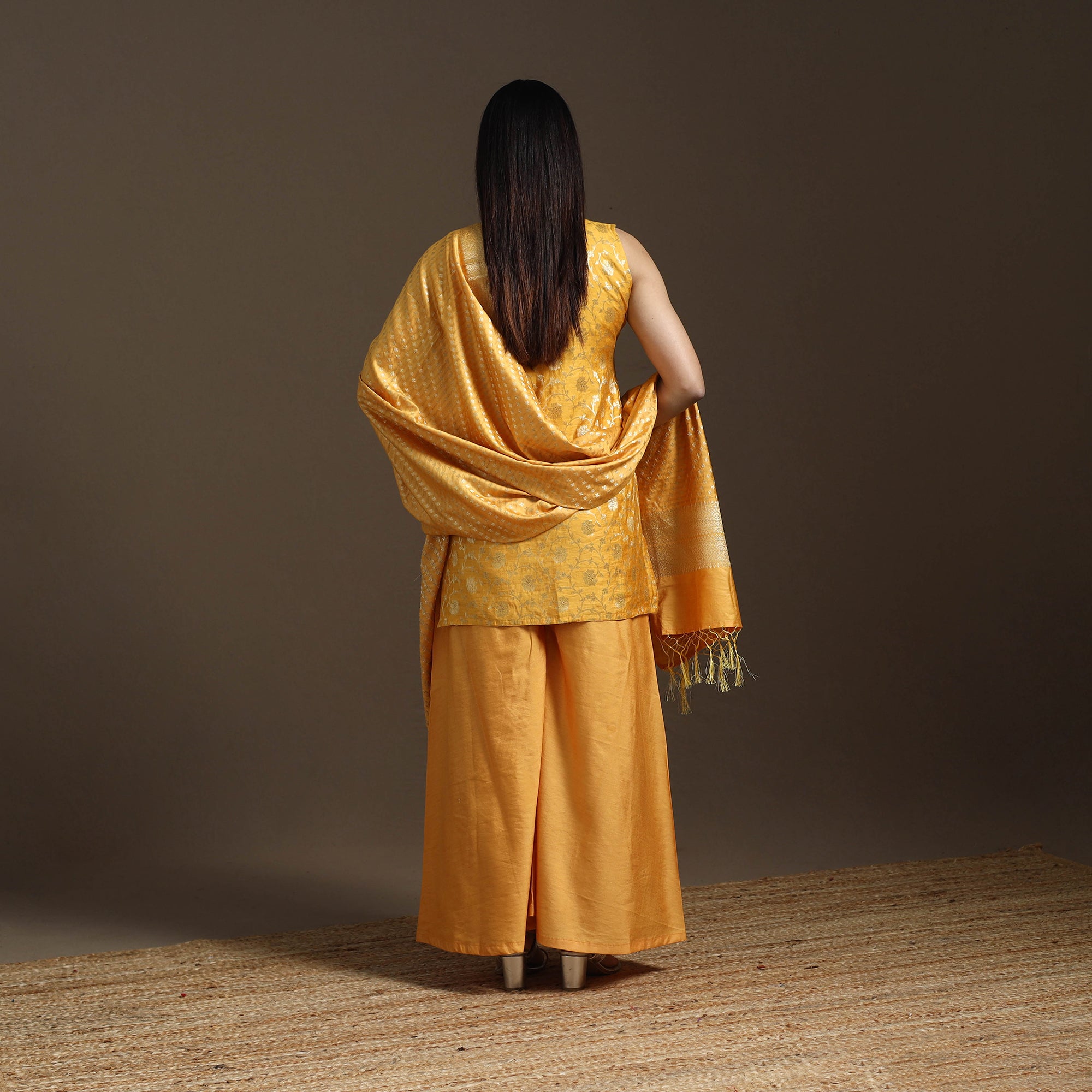 This yellow tanchoi silk-cotton banarasi short kurta with Palaazo set is designed to bring a regal charm to your festive wardrobe. The short, sleeveless kurta features exquisite zari weaving that reflects banarasi artistry. It is paired with a plain, flared palazzo featuring a comfortable elasticated waist for ease of wear and graceful movement. A coordinated banarasi dupatta completes the ensemble, making it an ideal choice for weddings, poojas, and grand gatherings where traditional charm meets modern style.