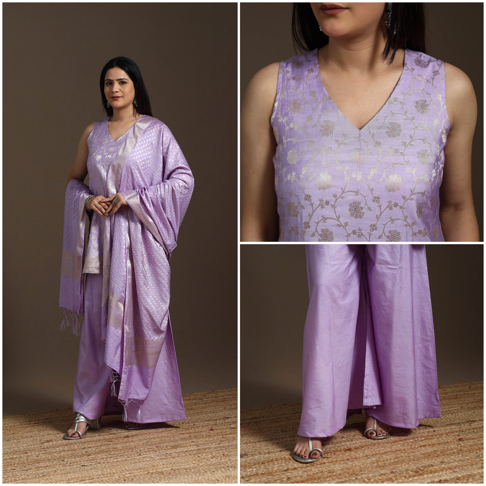This purple tanchoi silk-cotton banarasi short kurta with Palaazo set is designed to bring a regal charm to your festive wardrobe. The short, sleeveless kurta features exquisite zari weaving that reflects banarasi artistry. It is paired with a plain, flared palazzo featuring a comfortable elasticated waist for ease of wear and graceful movement. A coordinated banarasi dupatta completes the ensemble, making it an ideal choice for weddings, poojas, and grand gatherings where traditional charm meets modern style.