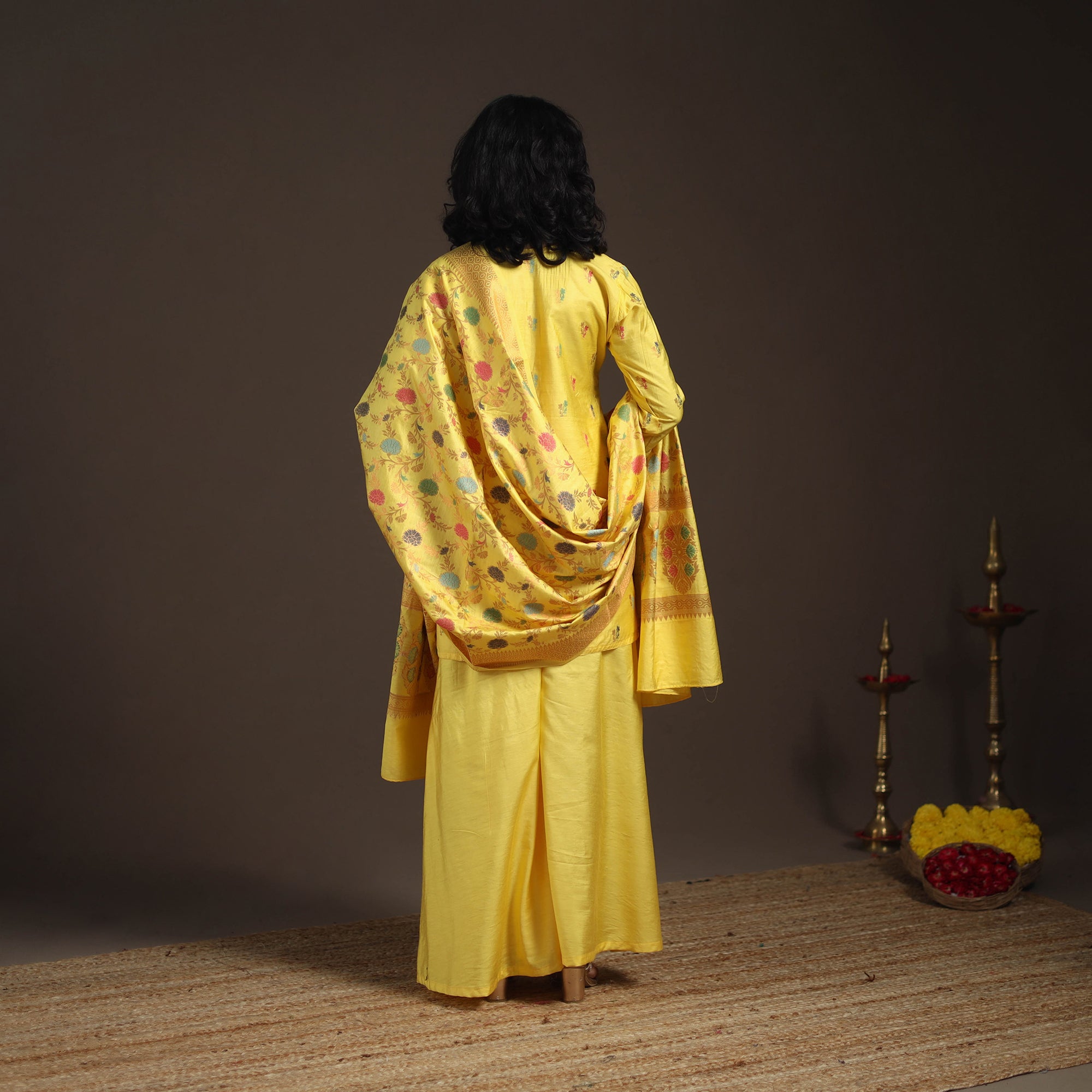 This yellow gota work meena weaving silk cotton banarasi kurta set is designed to bring a regal charm to your festive wardrobe. The short kurta features exquisite zari weaving that reflects banarasi artistry. It is paired with a plain, flared palazzo featuring a comfortable elasticated waist for ease of wear and graceful movement. A coordinated Banarasi dupatta completes the ensemble, making it an ideal choice for weddings, poojas, and grand gatherings where traditional charm meets modern style.