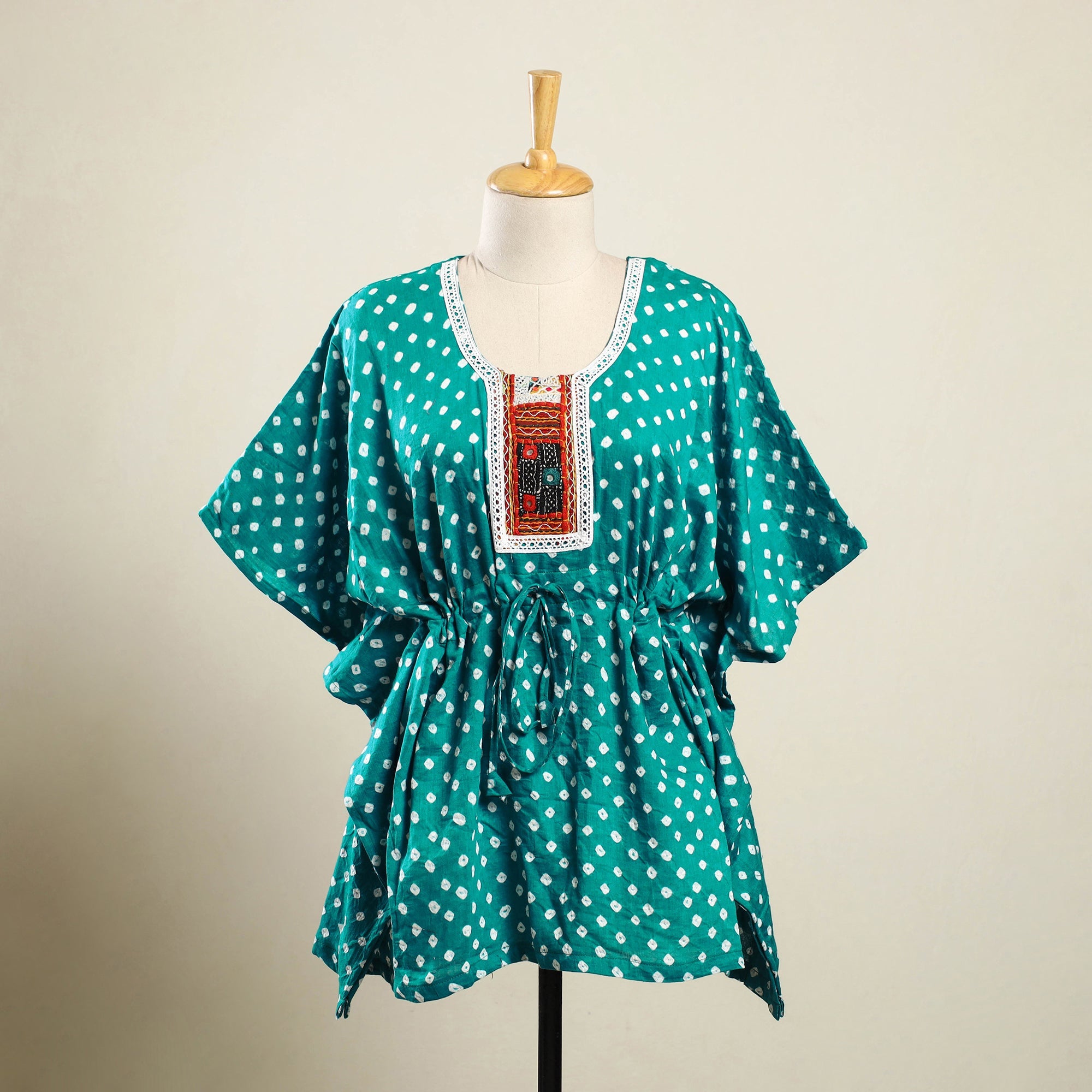 Green - Bandhani Cotton Kaftan with Desert Embroidery (Short) 08