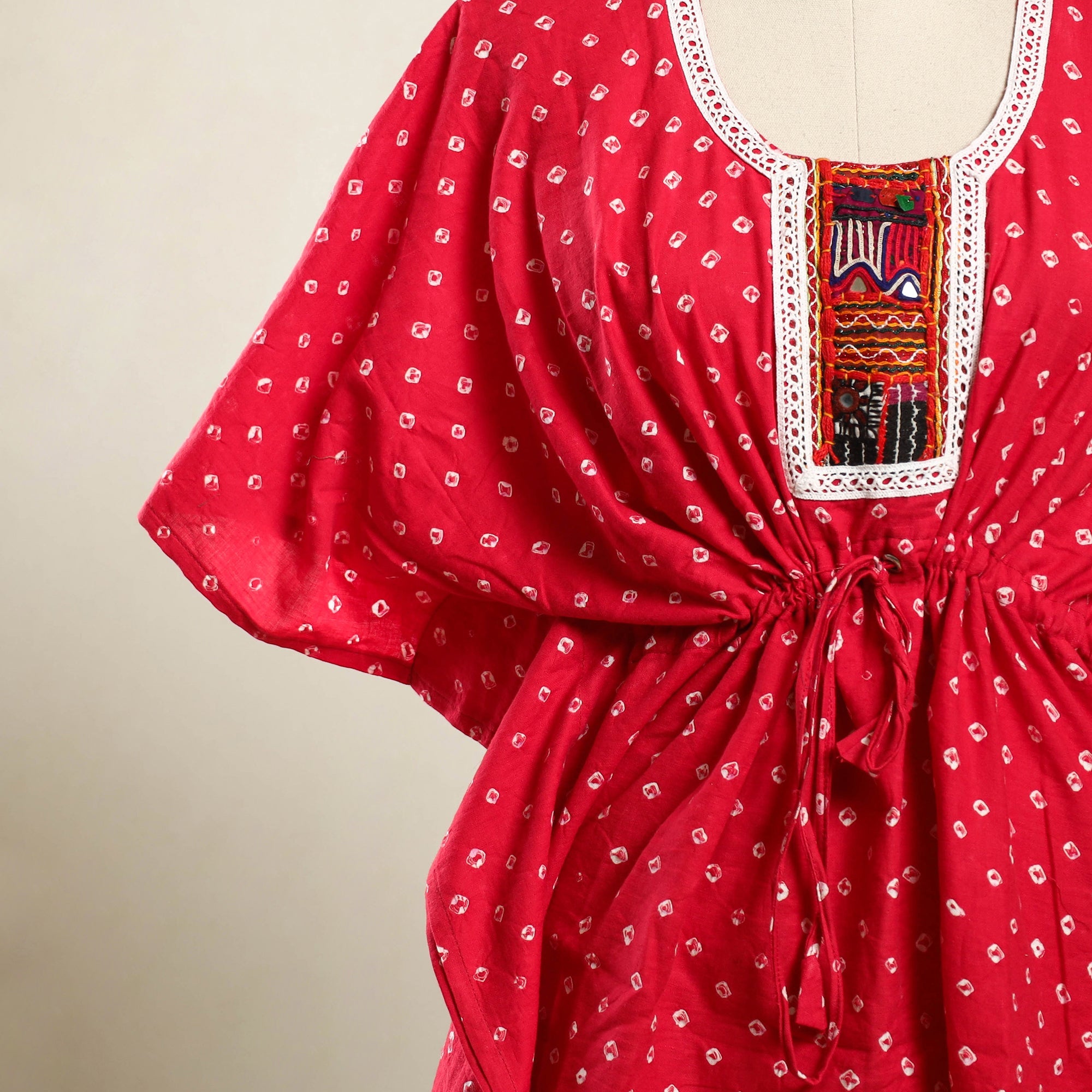 Enjoy effortless comfort in this red bandhani tie-dye kaftan with desert embroidery. Made from soft, breathable cotton, it features a drawstring waist for an adjustable fit. Perfect for lounging at home or stepping out for casual outings, this kaftan offers a relaxed feel with just the right touch of style.