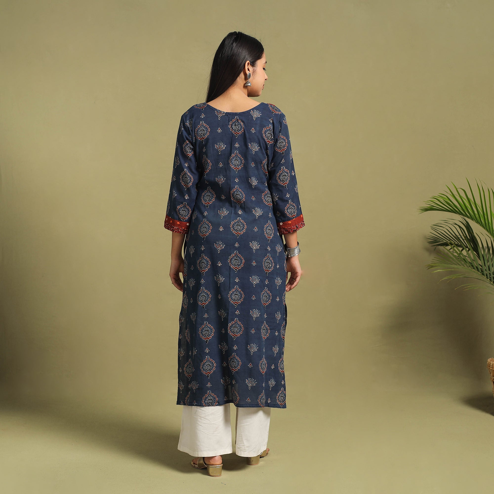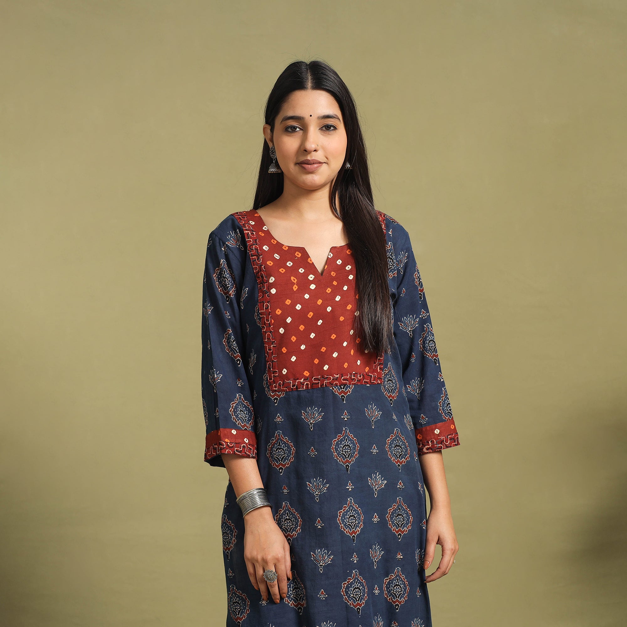 Elevate your everyday look with this beautifully crafted bandhani mosaic fusion blue ajrakh kurta made from breathable mul cotton. Hand block printed with natural dyes, it carries the timeless elegance of Kutch’s ajrakh art. Designed with a handy side pocket, it combines beauty with practicality, perfect for festivals, lunches, or your daily routine.