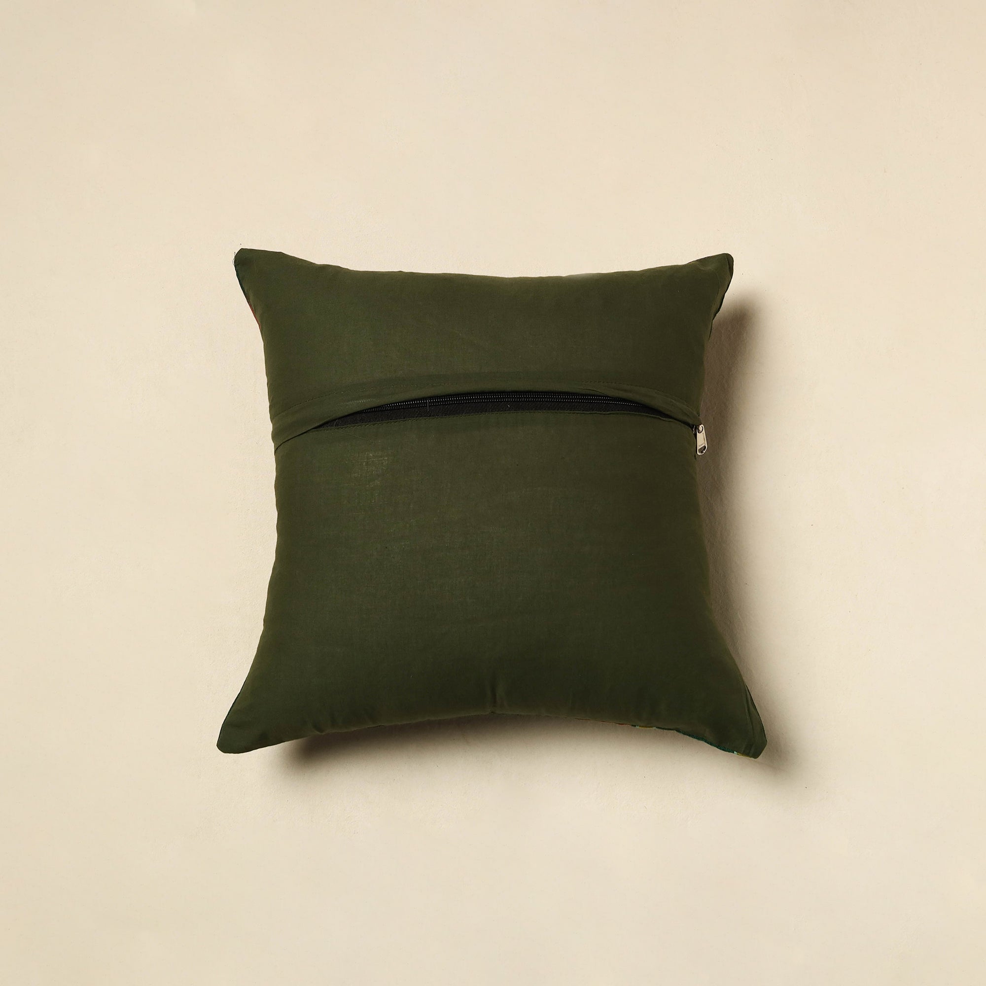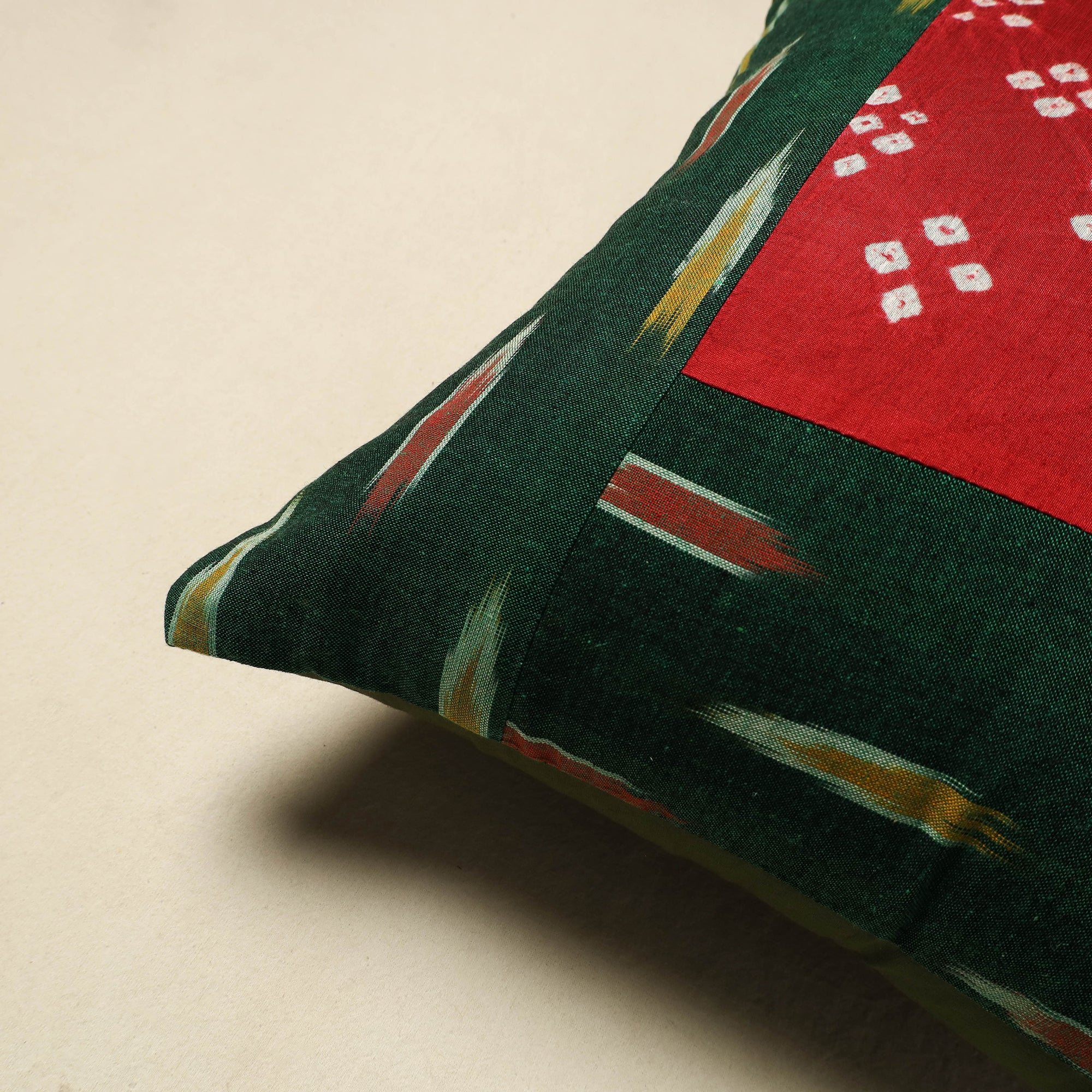 Elevate your space with this green Ikat cushion cover made from soft cotton and detailed with bandhani modal silk patchwork. Expertly created by artisans, its vibrant patterns and rich textures bring a timeless touch to sofas, cozy corners, and bedrooms chairs, or as a thoughtful gift.
