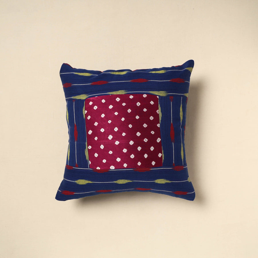 Elevate your space with this blue Ikat cushion cover made from soft cotton and detailed with bandhani modal silk patchwork. Expertly created by artisans, its vibrant patterns and rich textures bring a timeless touch to sofas, cozy corners, and bedrooms chairs, or as a thoughtful gift.