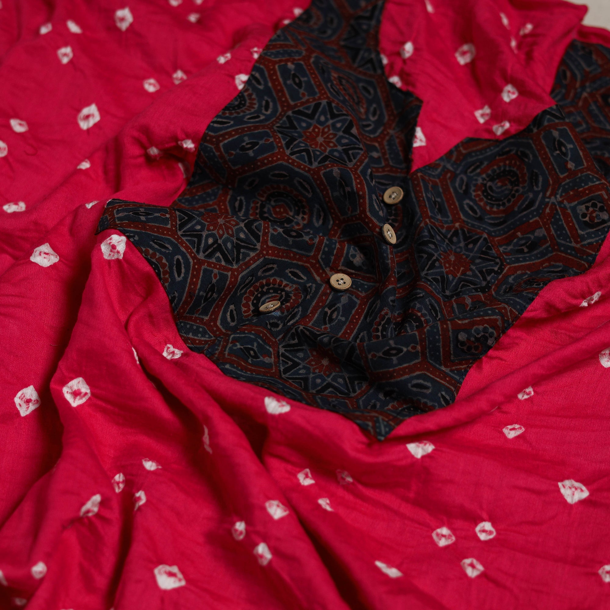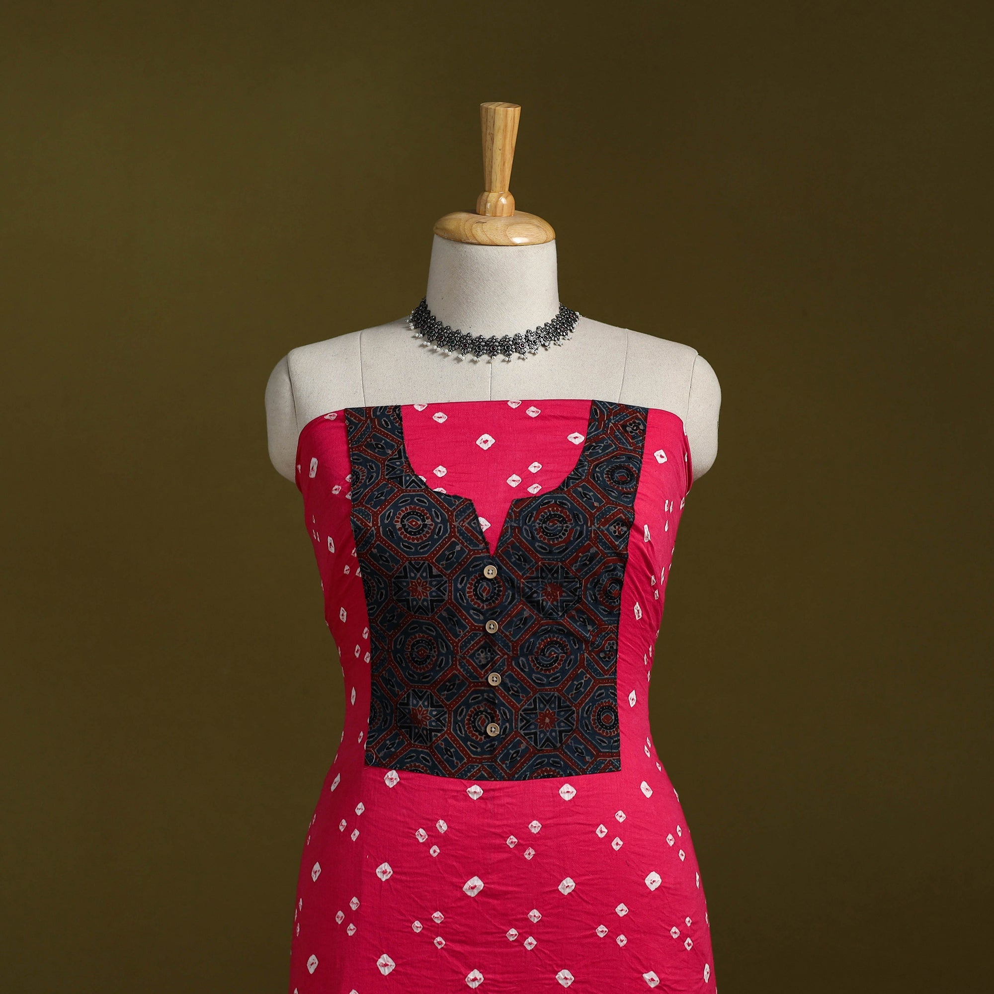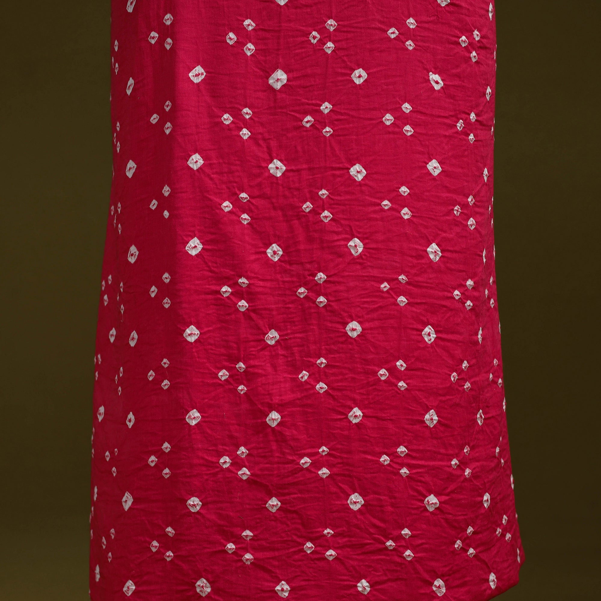 Bandhani cotton unstitched kurta material from Kutch. Made using traditional tie-dye technique, to create bandhej patterns. It features patchwork detailing, which adds a handcrafted touch. Ideal for stitching kurtas, fusion tops or tunics.