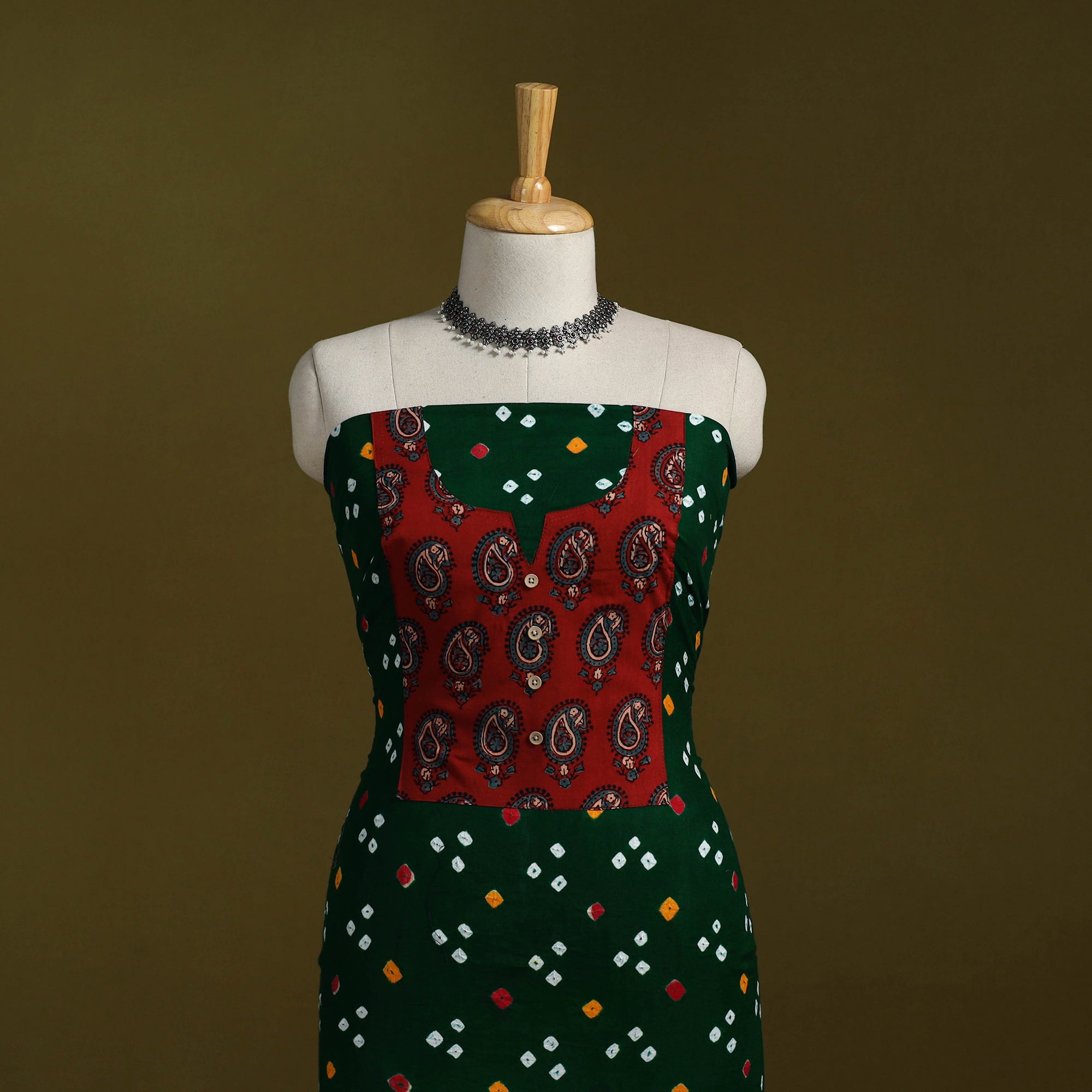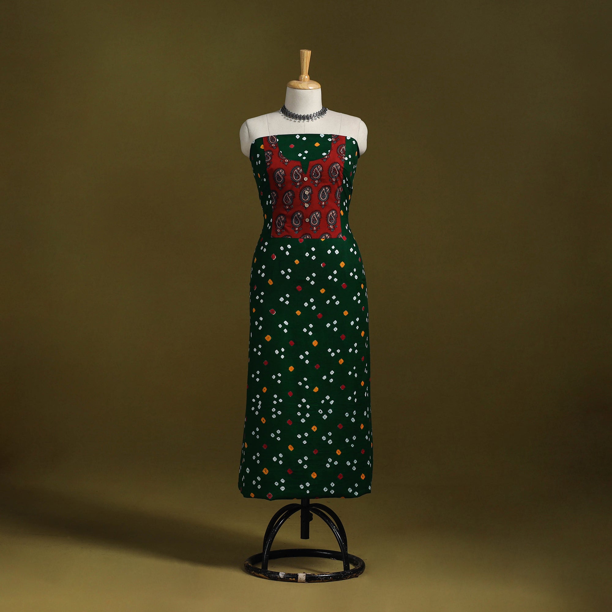 Green - Bandhani Patchwork Cotton Unstitched Kurta Material (3m) 08