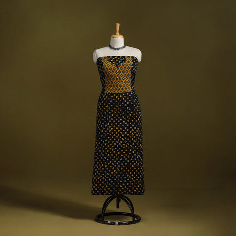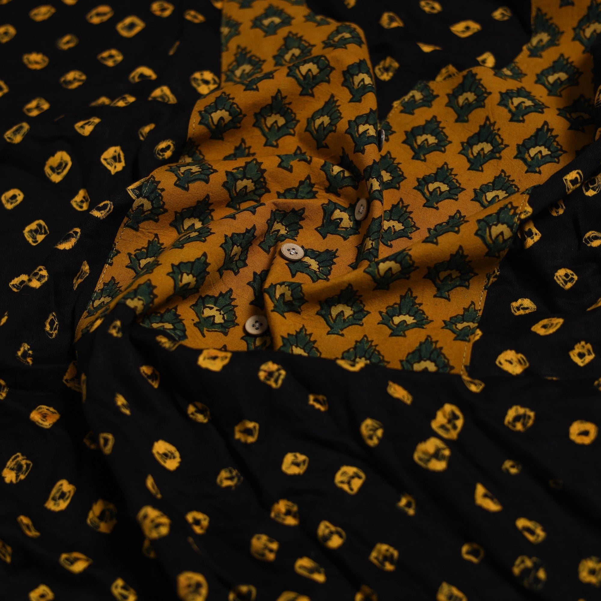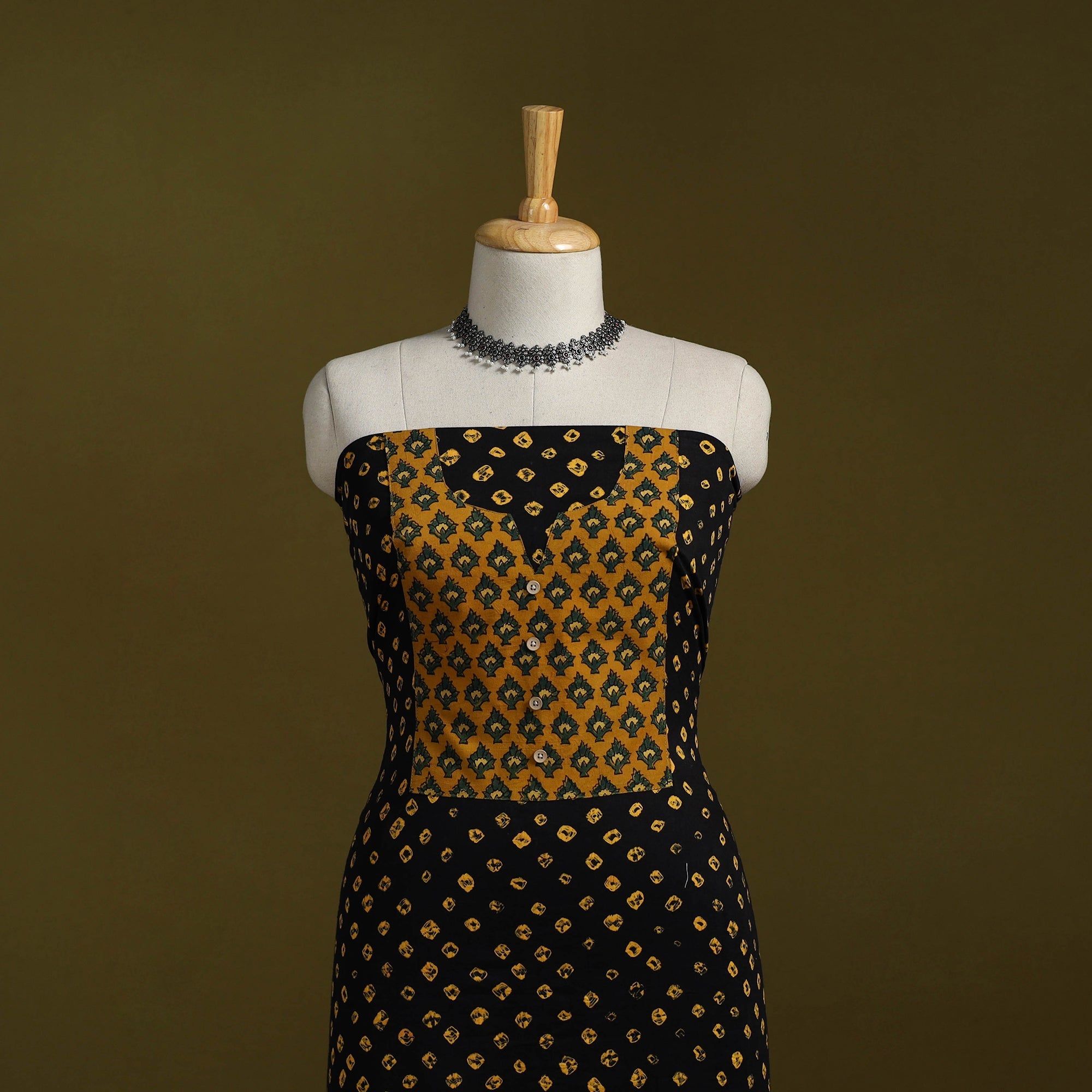 Black bandhani cotton unstitched kurta material from Kutch. Made using traditional tie-dye technique, to create bandhej patterns. It features patchwork detailing, which adds a handcrafted touch. Ideal for stitching kurtas, fusion tops or tunics.