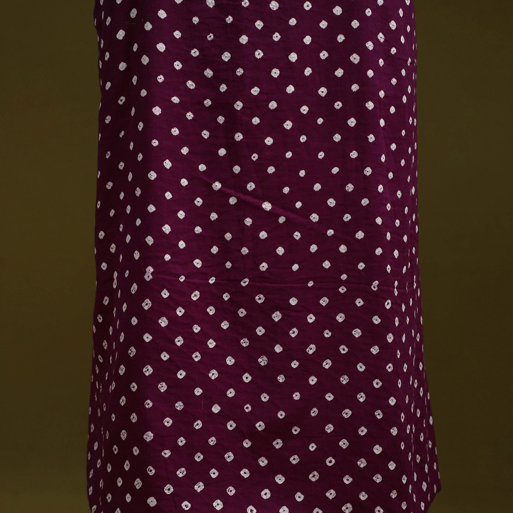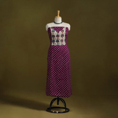Purple bandhani cotton unstitched kurta material from Kutch. Made using traditional tie-dye technique, to create bandhej patterns. It features patchwork detailing, which adds a handcrafted touch. Ideal for stitching kurtas, fusion tops or tunics.