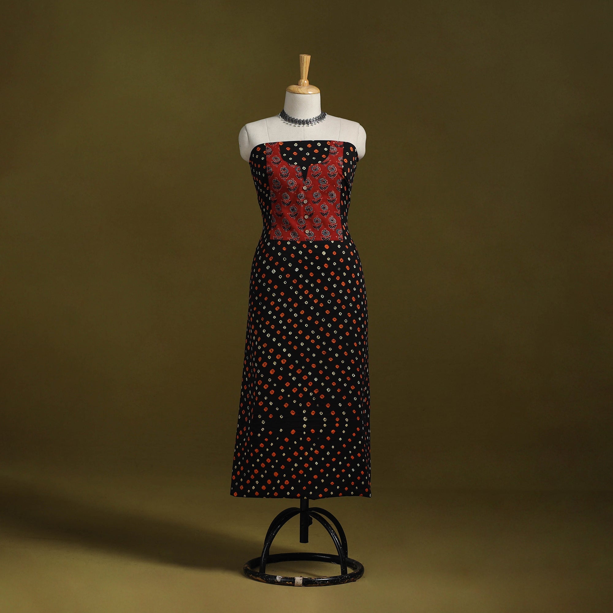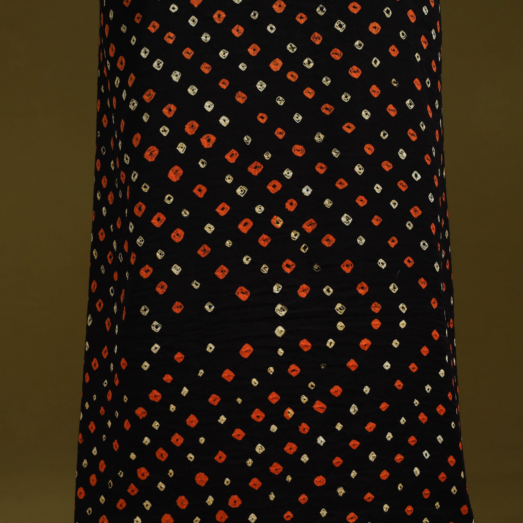Bandhani cotton unstitched kurta material from Kutch. Made using traditional tie-dye technique, to create bandhej patterns. It features patchwork detailing, which adds a handcrafted touch. Ideal for stitching kurtas, fusion tops or tunics.