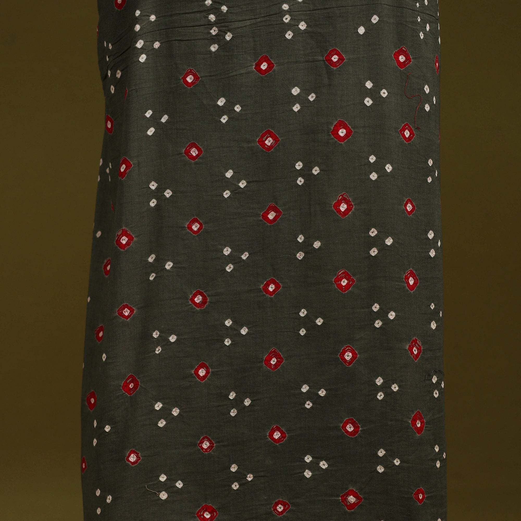 Grey bandhani cotton unstitched kurta material from Kutch. Made using traditional tie-dye technique, to create bandhej patterns. It features patchwork detailing, which adds a handcrafted touch. Ideal for stitching kurtas, fusion tops or tunics.