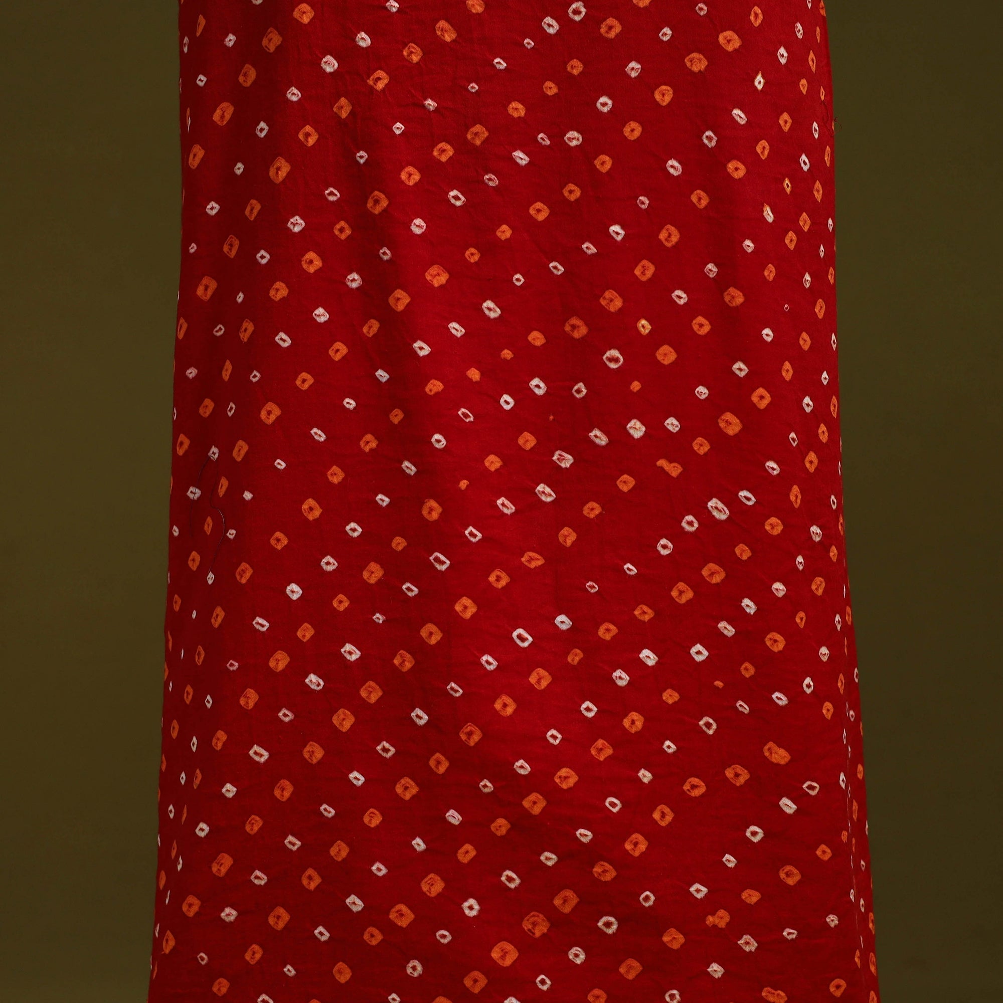 Red bandhani cotton unstitched kurta material from Kutch. Made using traditional tie-dye technique, to create bandhej patterns. It features patchwork detailing, which adds a handcrafted touch. Ideal for stitching kurtas, fusion tops or tunics.