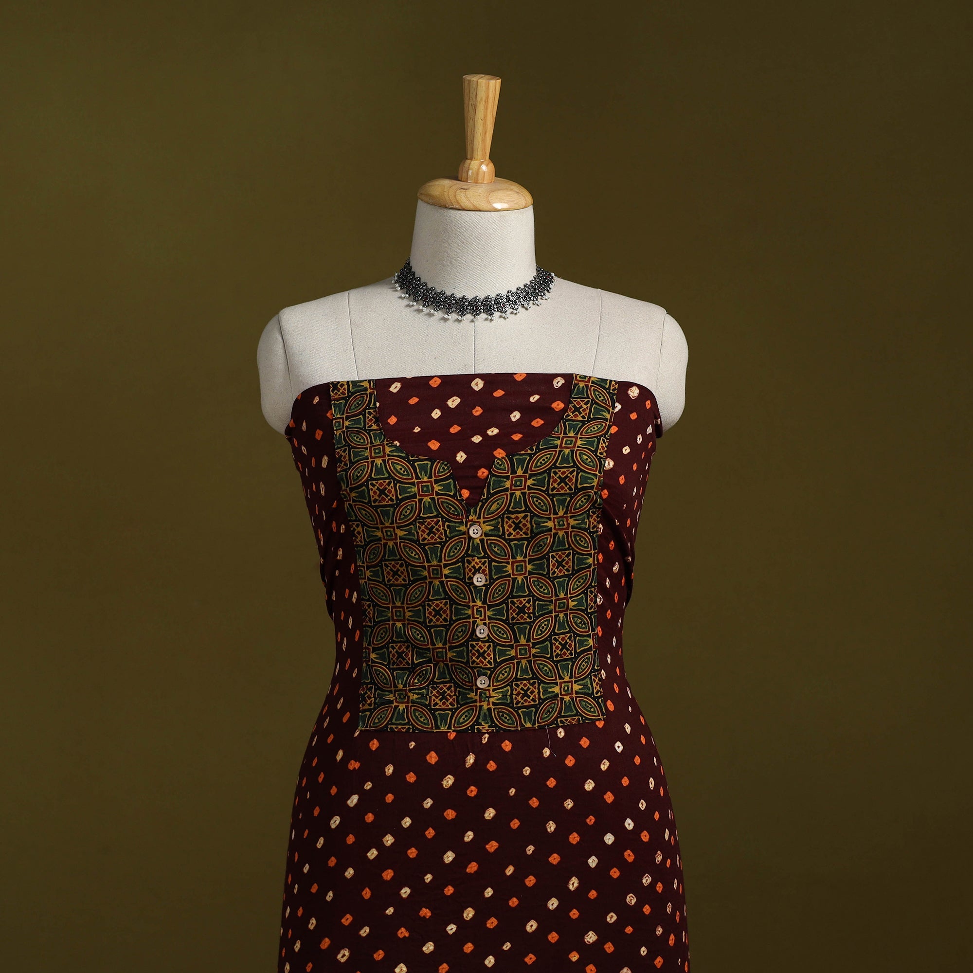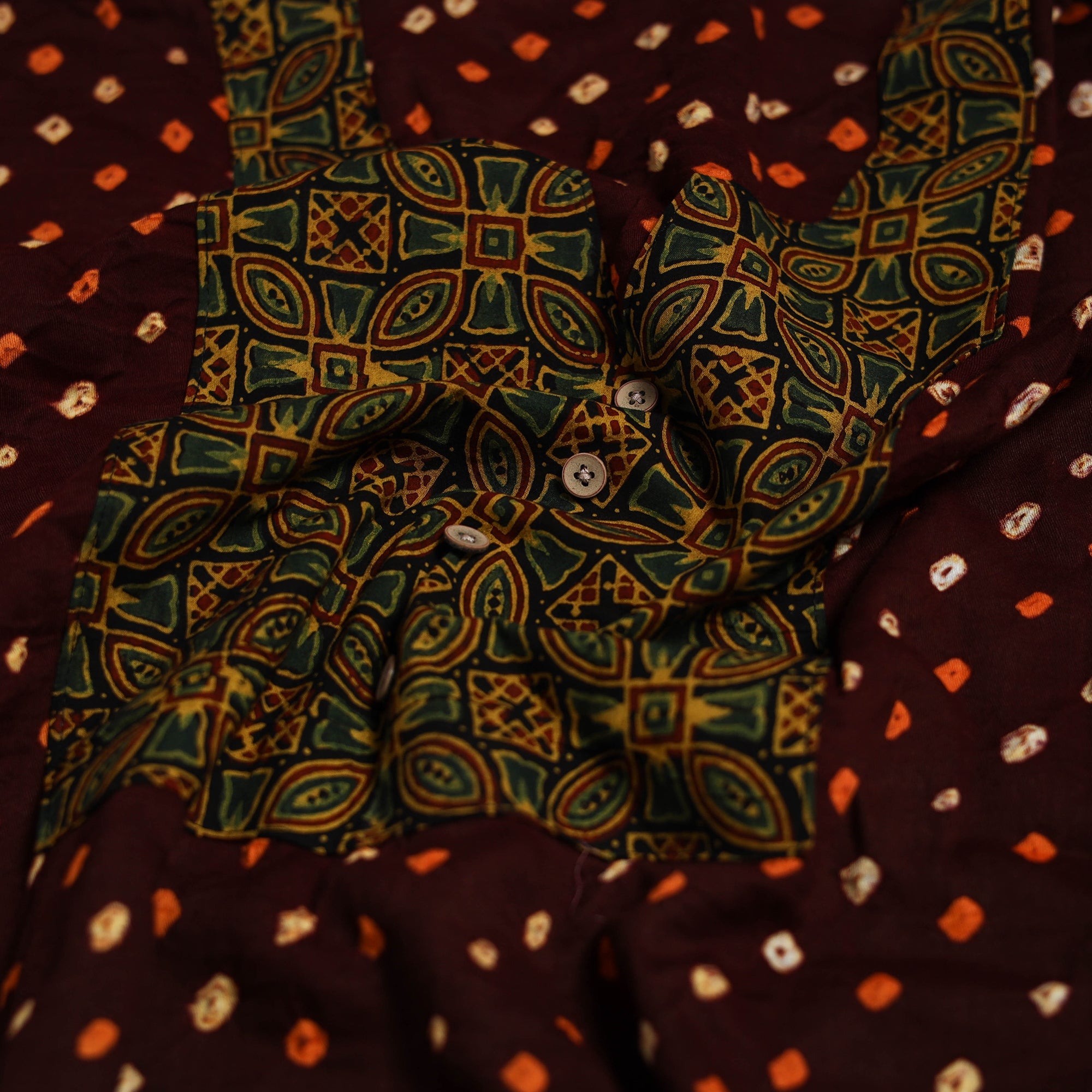 Bandhani cotton unstitched kurta material from Kutch. Made using traditional tie-dye technique, to create bandhej patterns. It features patchwork detailing, which adds a handcrafted touch. Ideal for stitching kurtas, fusion tops or tunics.