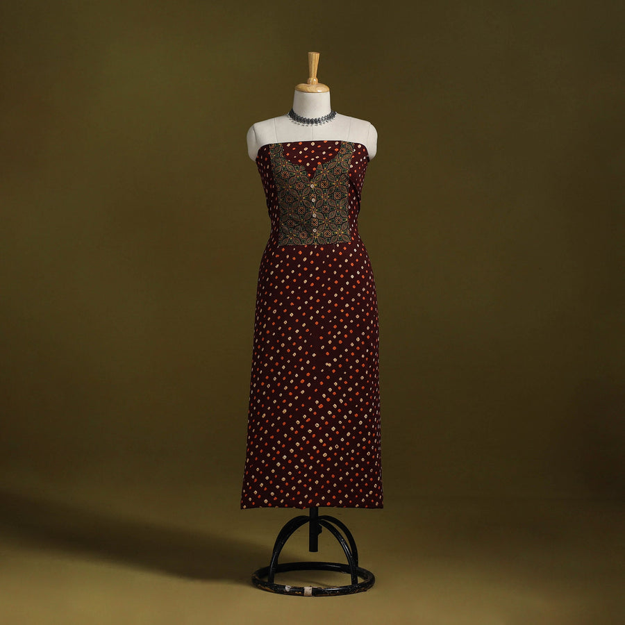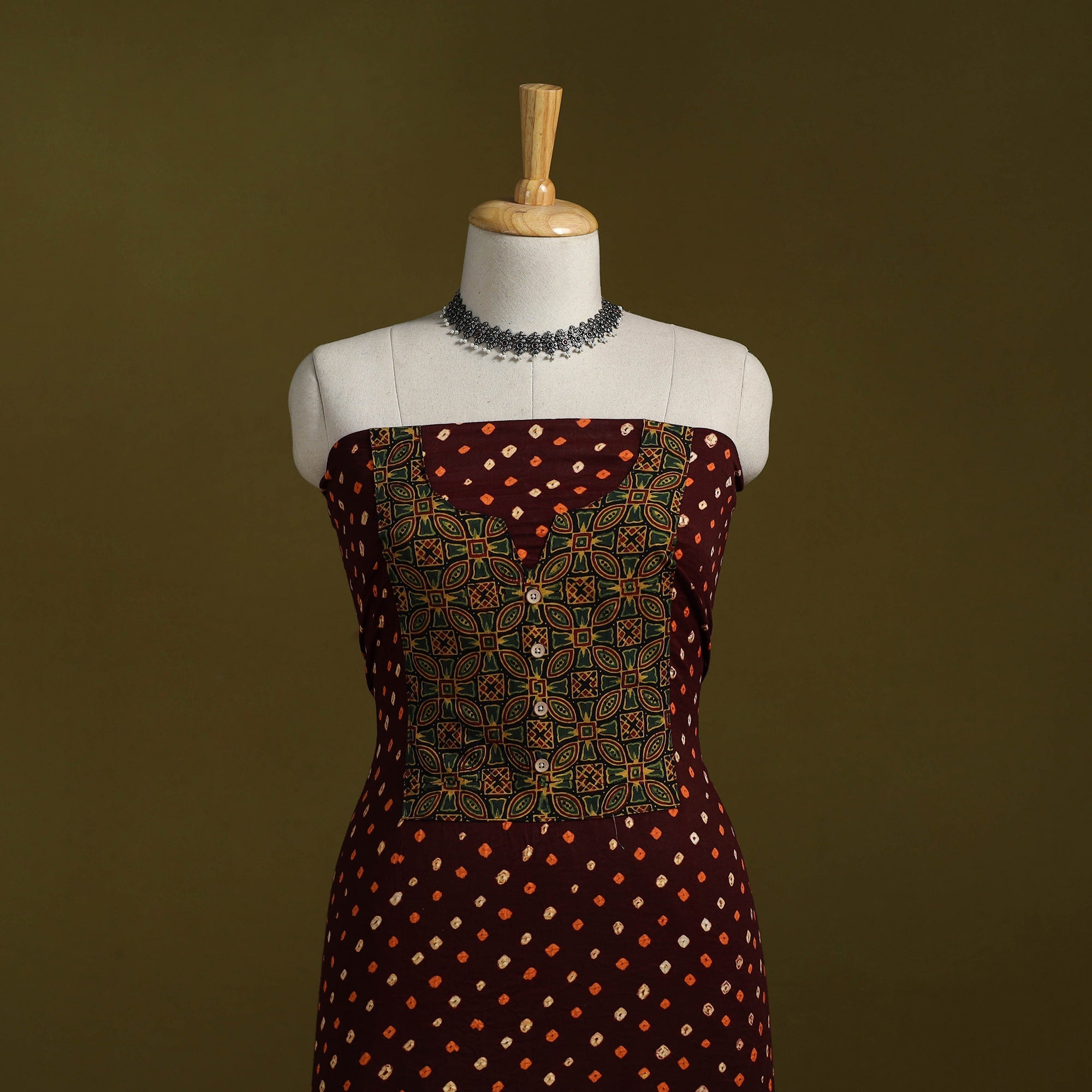 Maroon bandhani cotton unstitched kurta material from Kutch. Made using traditional tie-dye technique, to create bandhej patterns. It features patchwork detailing, which adds a handcrafted touch. Ideal for stitching kurtas, fusion tops or tunics.