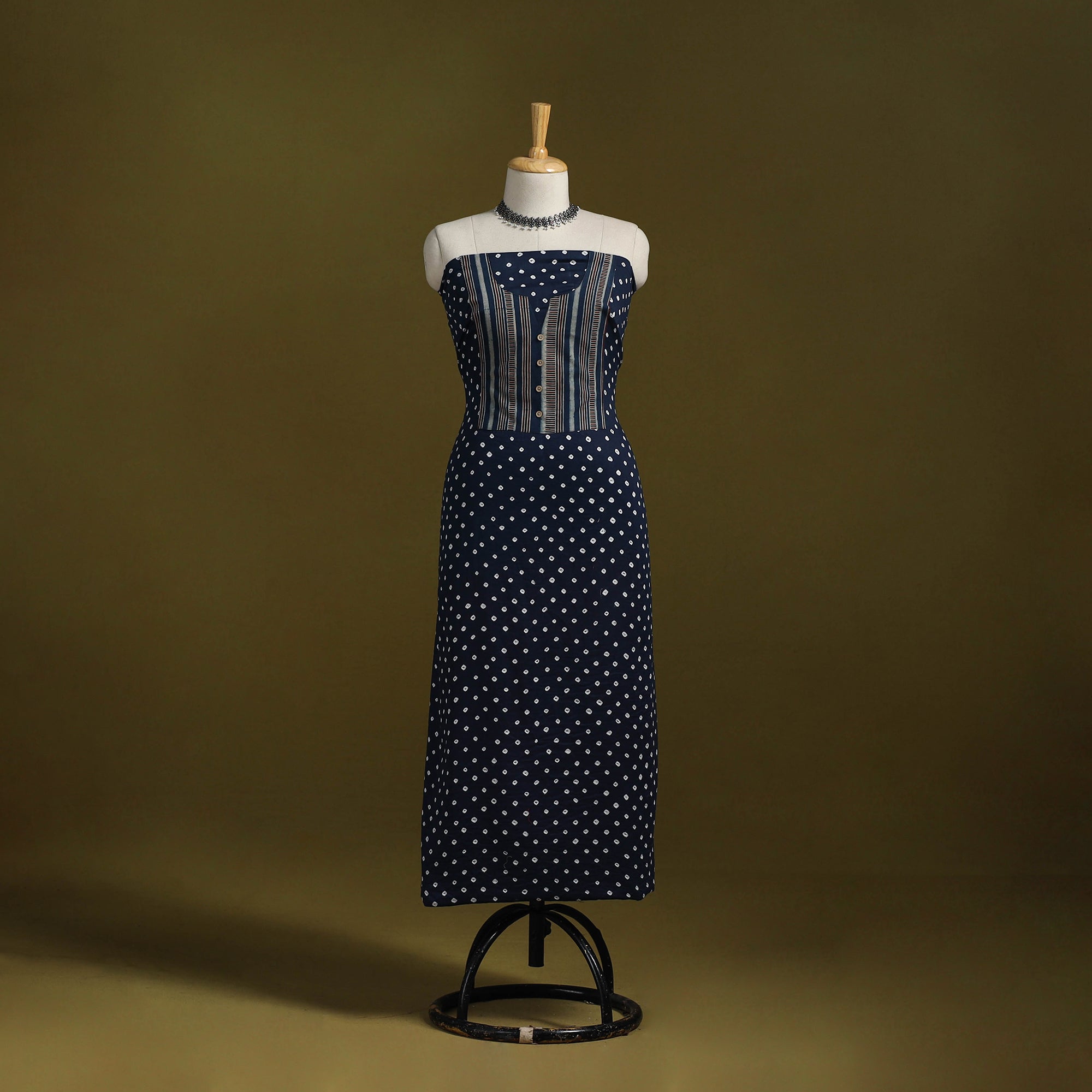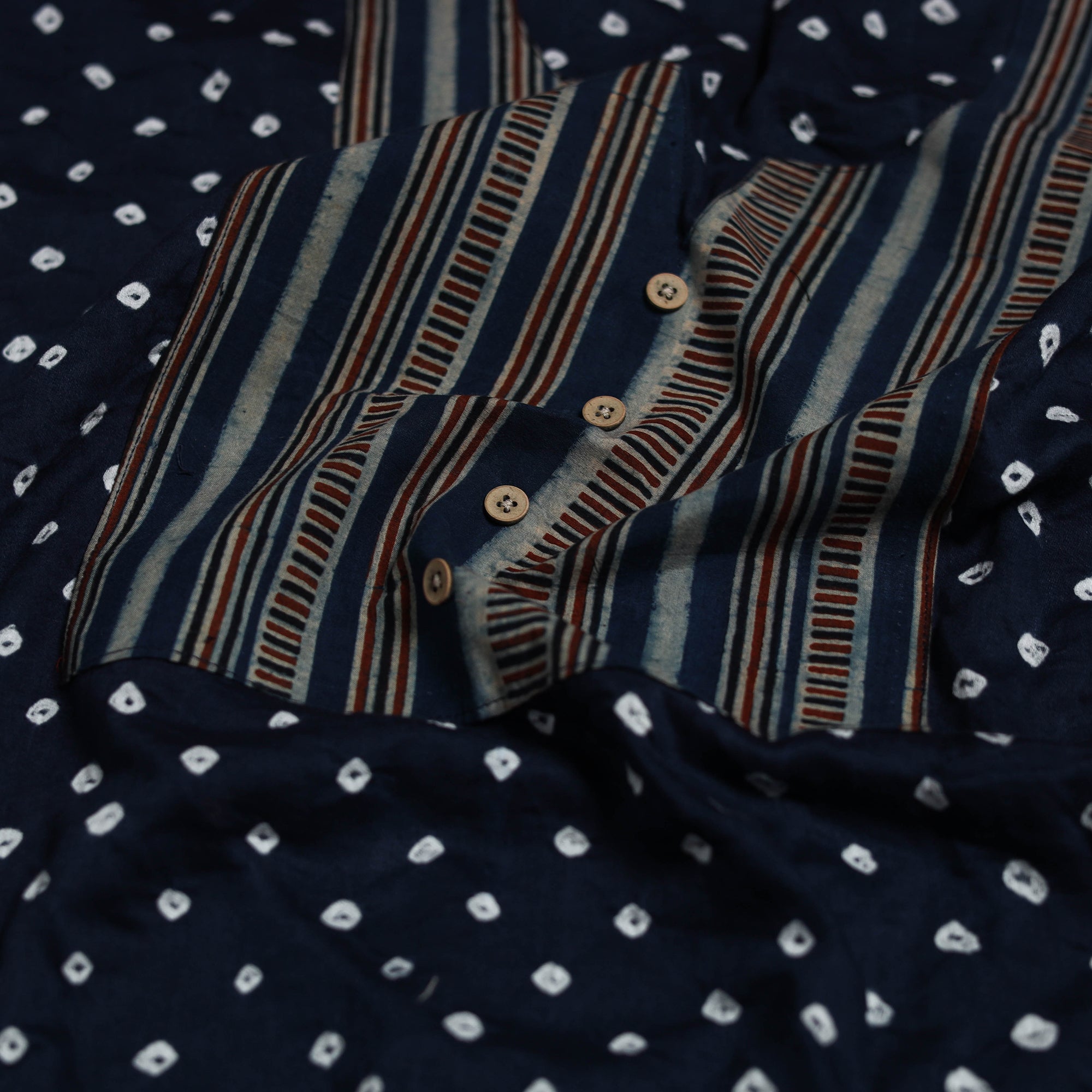 Bandhani cotton unstitched kurta material from Kutch. Made using traditional tie-dye technique, to create bandhej patterns. It features patchwork detailing, which adds a handcrafted touch. Ideal for stitching kurtas, fusion tops or tunics.