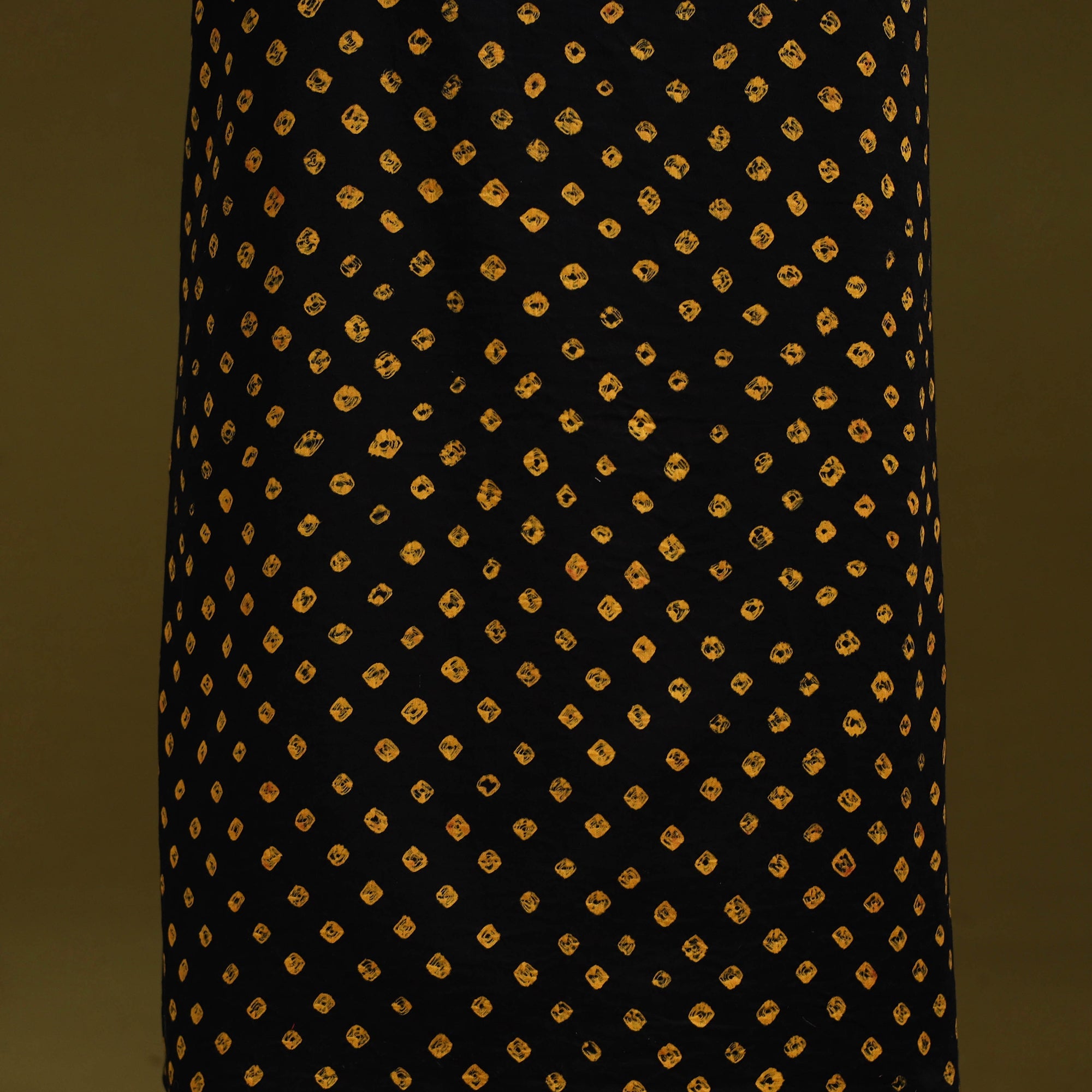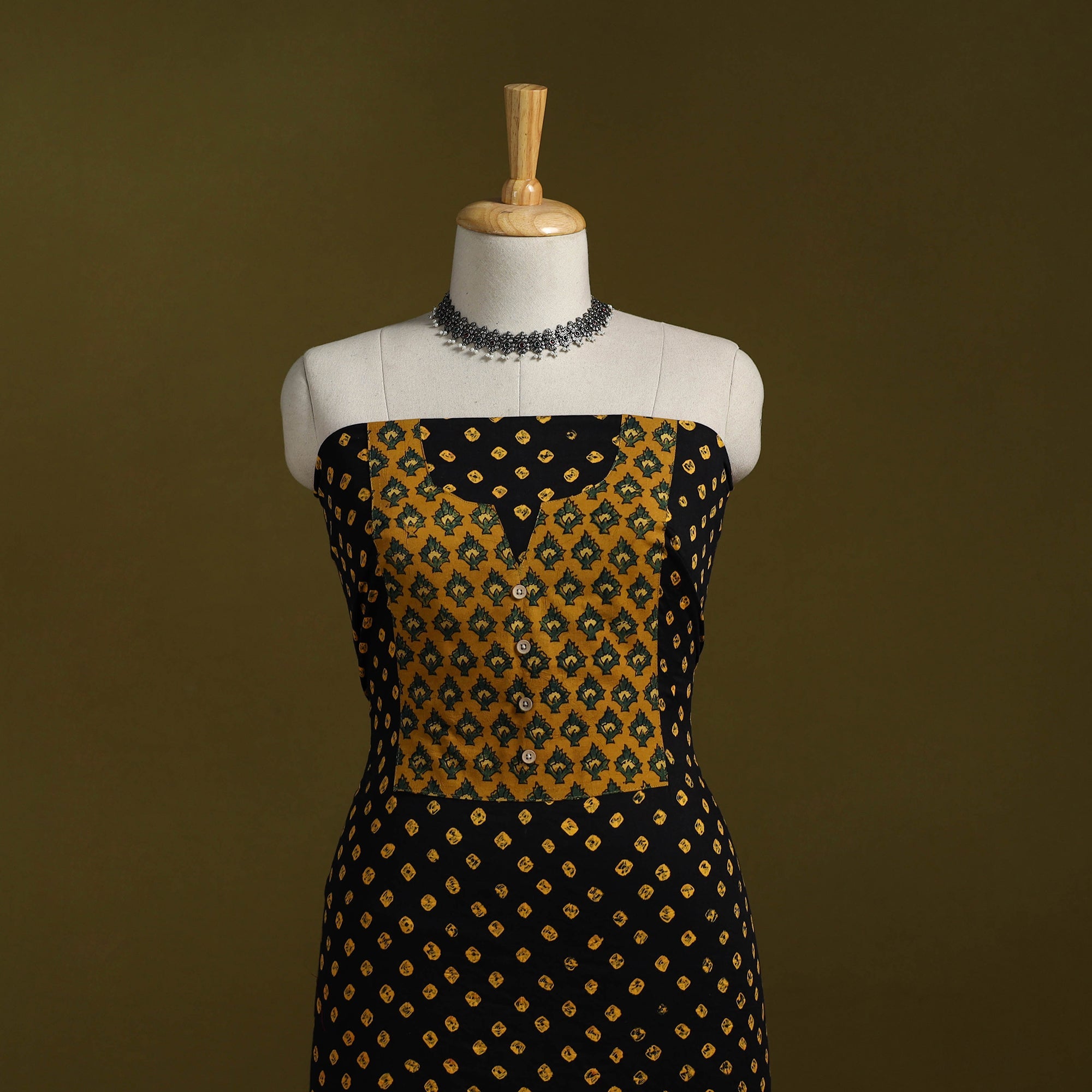 Bandhani cotton unstitched kurta material from Kutch. Made using traditional tie-dye technique, to create bandhej patterns. It features patchwork detailing, which adds a handcrafted touch. Ideal for stitching kurtas, fusion tops or tunics.