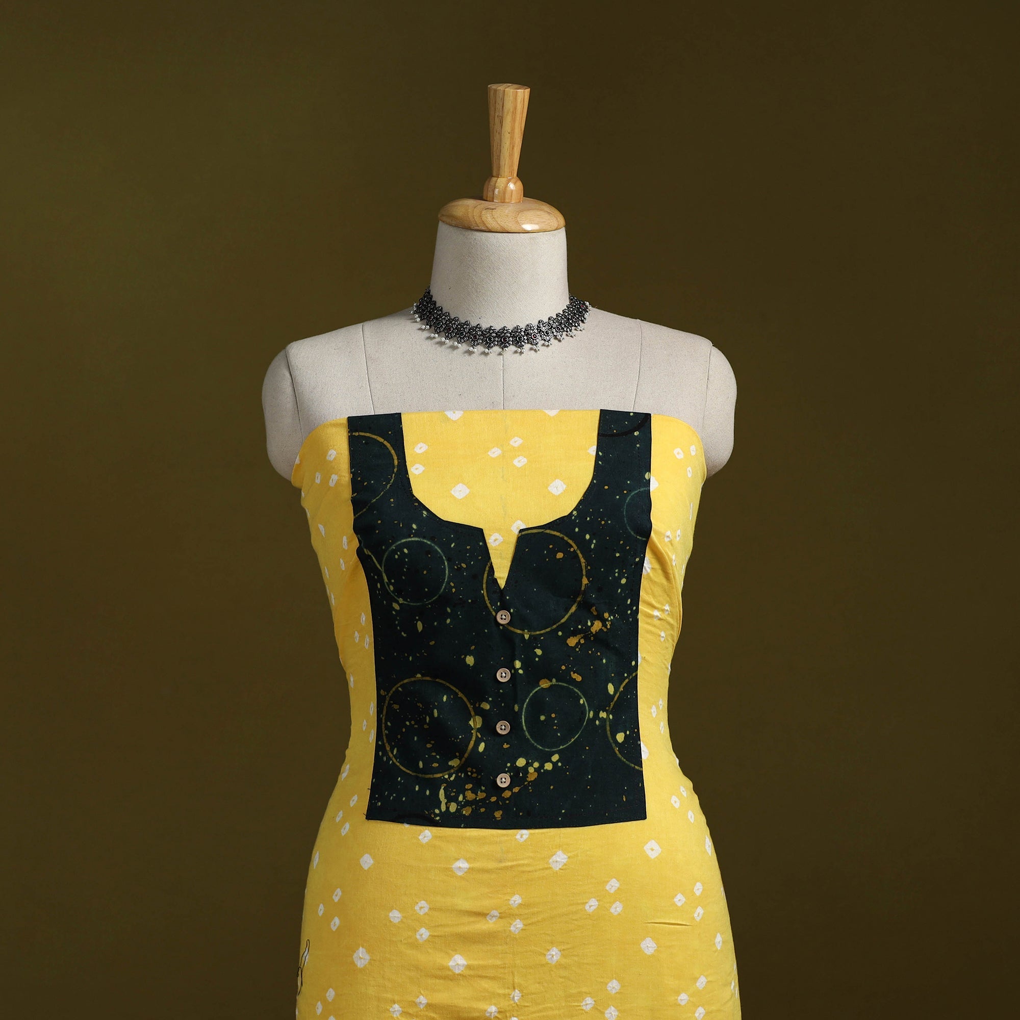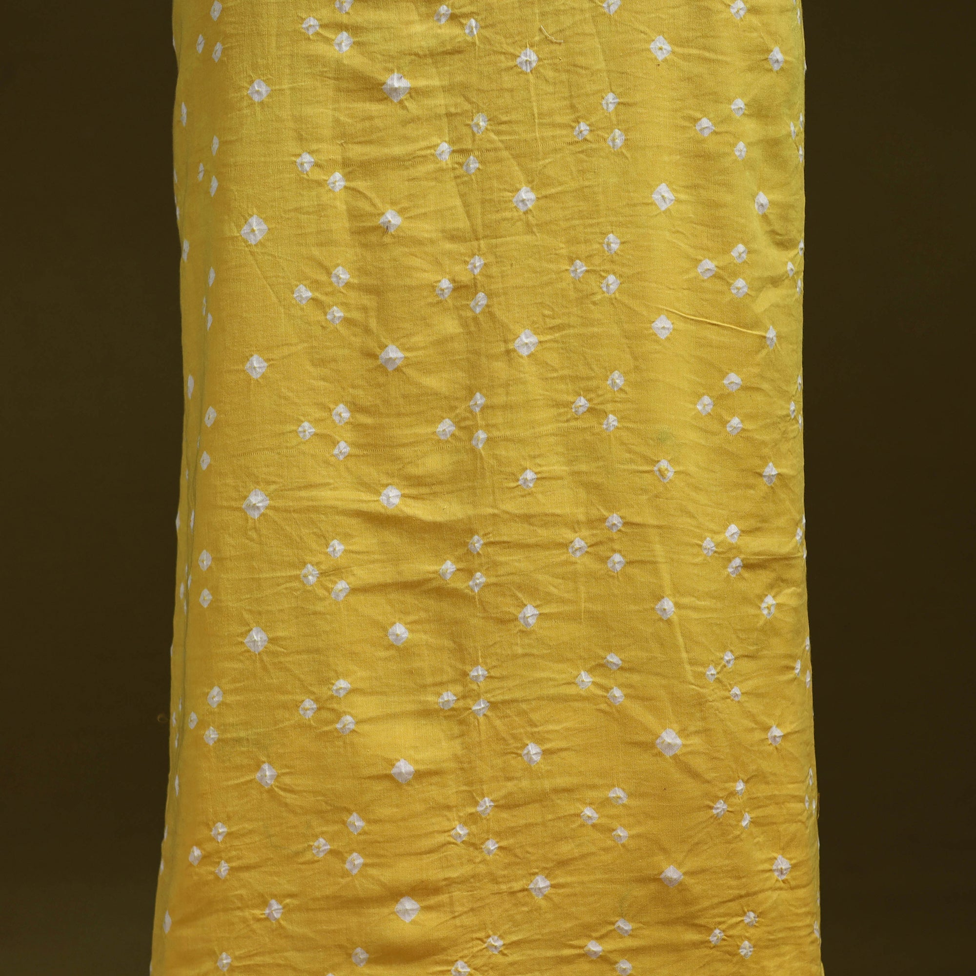 Yellow bandhani cotton unstitched kurta material from Kutch. Made using traditional tie-dye technique, to create bandhej patterns. It features patchwork detailing, which adds a handcrafted touch. Ideal for stitching kurtas, fusion tops or tunics.