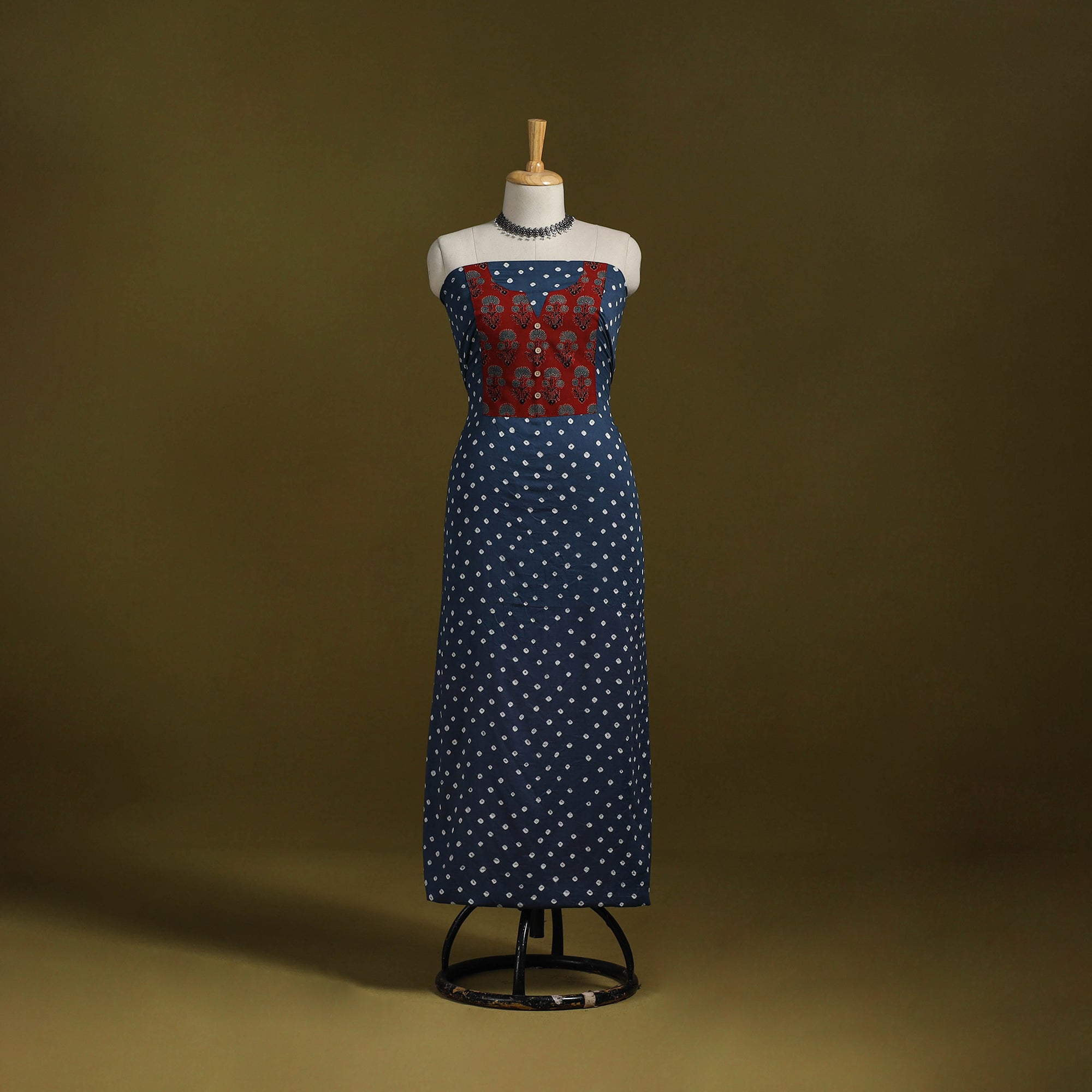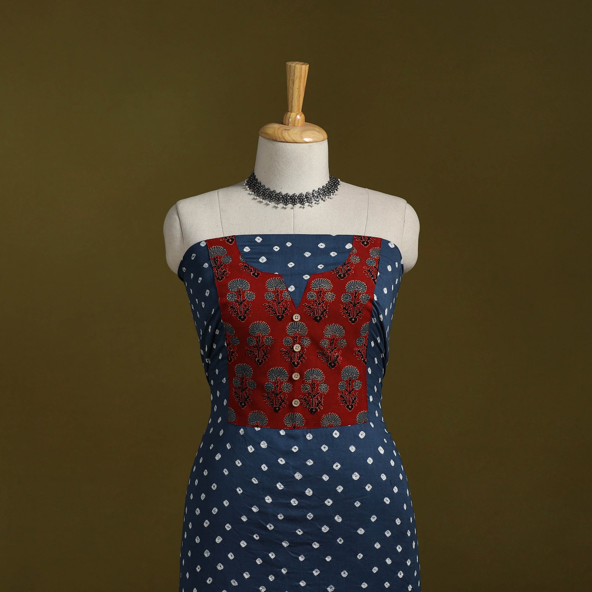 Blue bandhani cotton unstitched kurta material from Kutch. Made using traditional tie-dye technique, to create bandhej patterns. It features patchwork detailing, which adds a handcrafted touch. Ideal for stitching kurtas, fusion tops or tunics.
