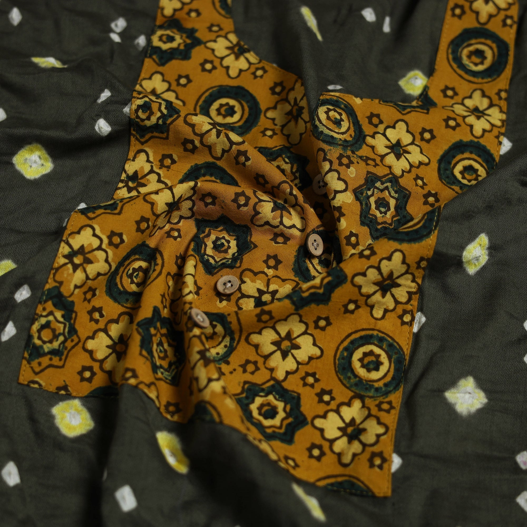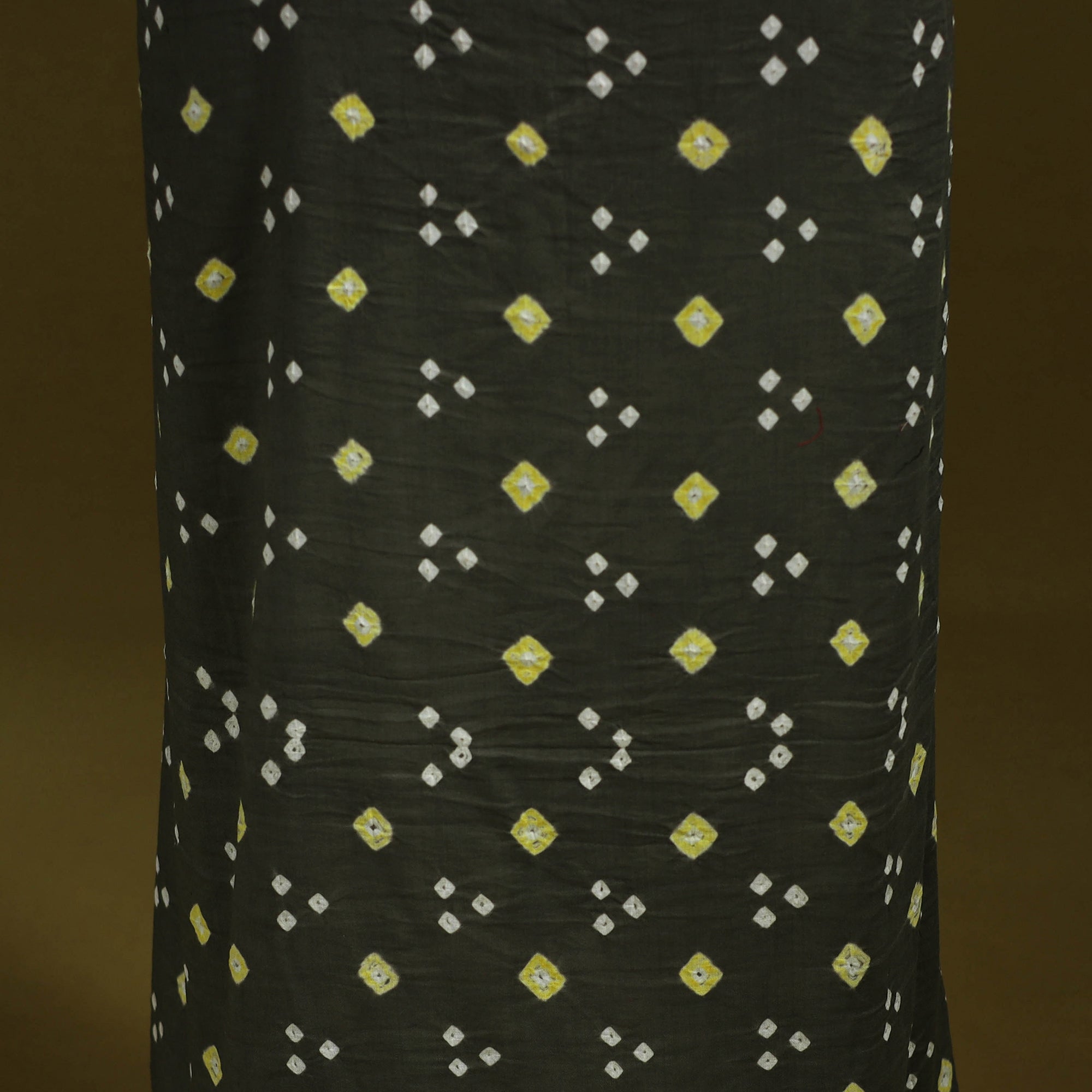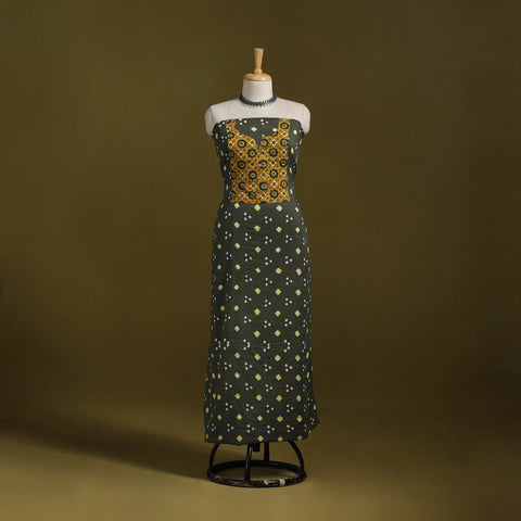 Grey bandhani cotton unstitched kurta material from Kutch. Made using traditional tie-dye technique, to create bandhej patterns. It features patchwork detailing, which adds a handcrafted touch. Ideal for stitching kurtas, fusion tops or tunics.