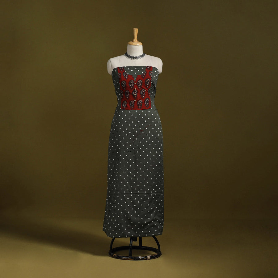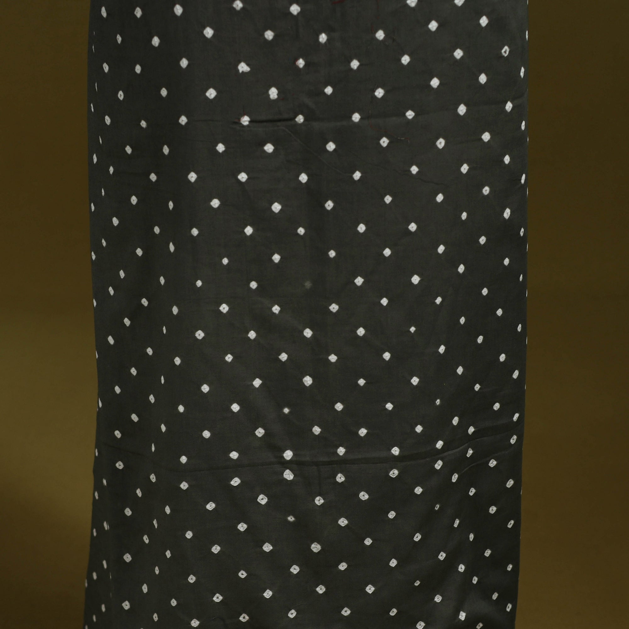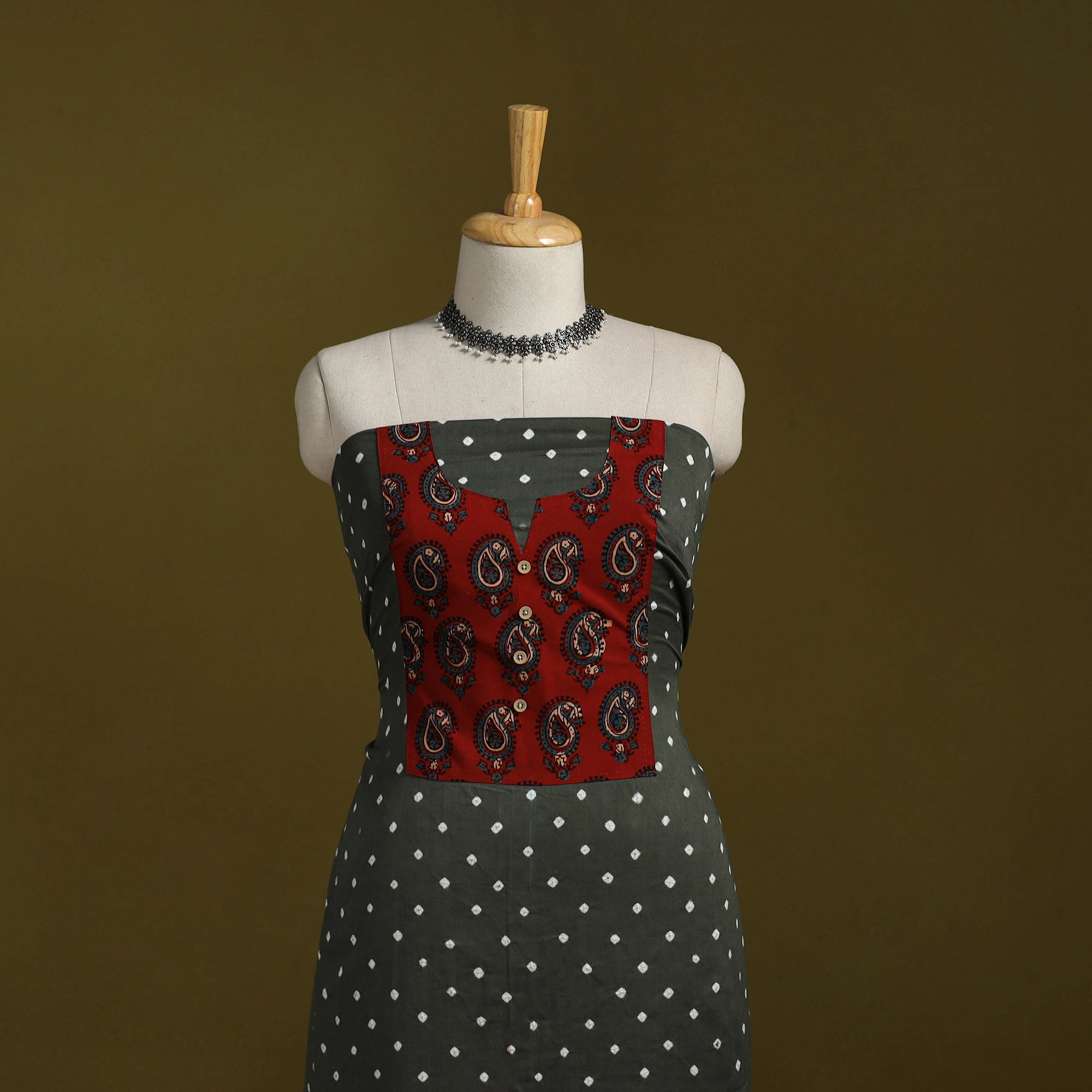 Grey bandhani cotton unstitched kurta material from Kutch. Made using traditional tie-dye technique, to create bandhej patterns. It features patchwork detailing, which adds a handcrafted touch. Ideal for stitching kurtas, fusion tops or tunics.
